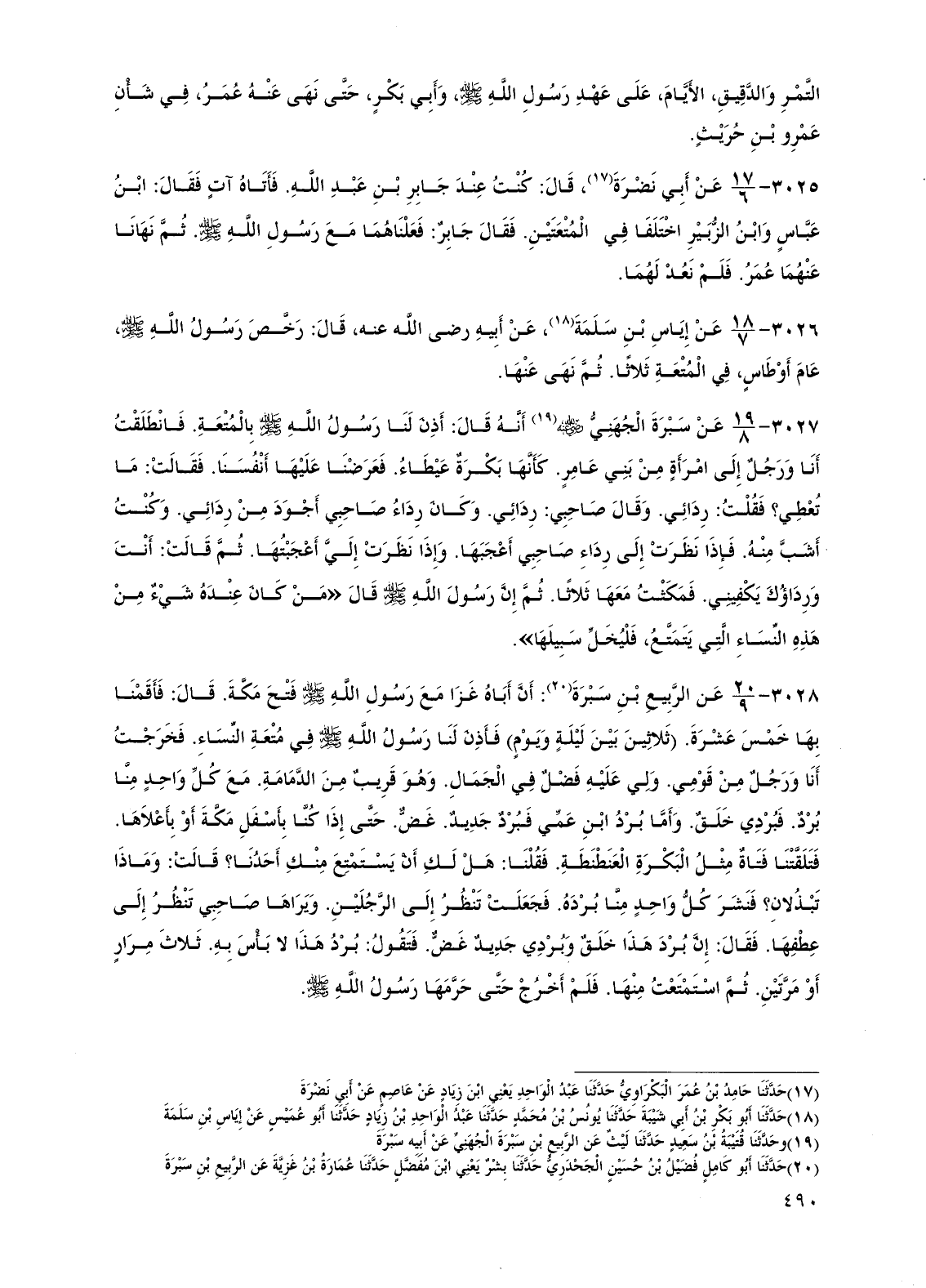 3026 - عن إياس بن سلمة، عن أبيه رضي الله عنه، قال: رخص رسول الله صلى الله عليه وسلم، عام أوطاس، في المتعة ثلاثاً. ثم نهى عنها.