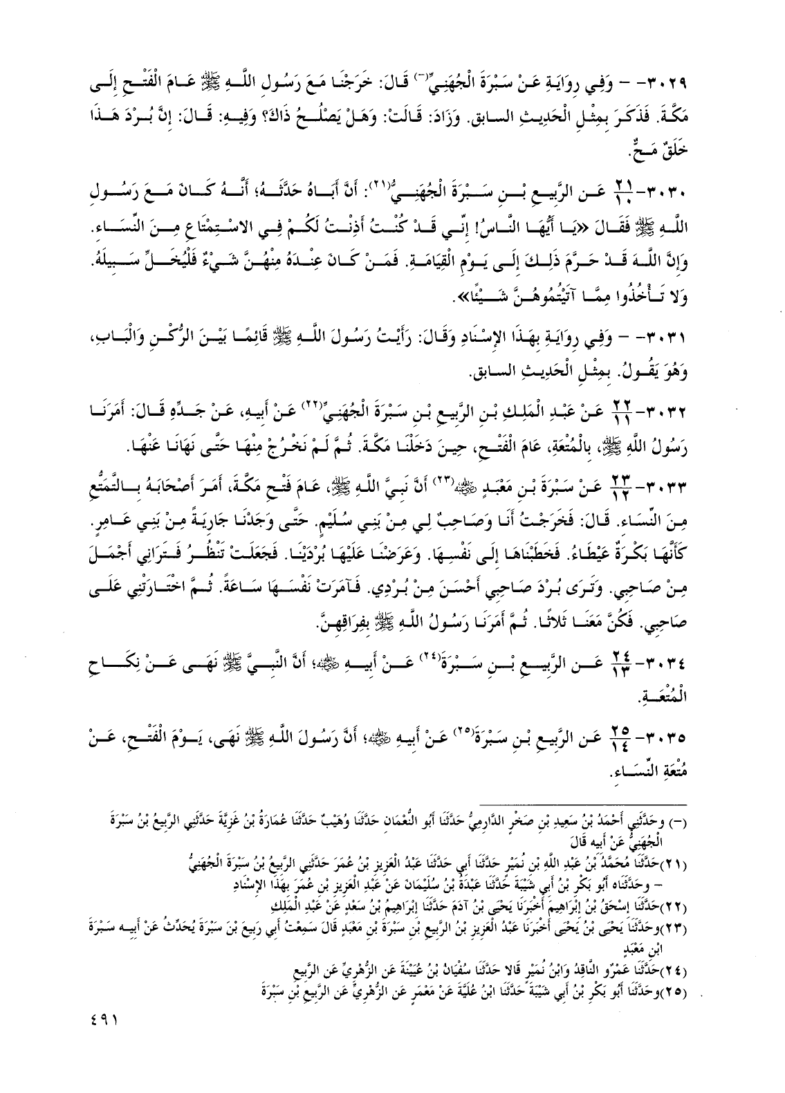 3030 - عن الربيع بن سبرة الجهني: أن أباه حدثه؛ أنه كان مع رسول الله صلى الله عليه وسلم فقال "يا أيها الناس! إني قد كنت أذنت لكم في الاستمتاع من النساء. وإن الله قد حرم ذلك إلى يوم القيامة. فمن كان عنده منهن شيء فليخل سبيله. ولا تأخذوا مما آتيتموهن شيئاً".