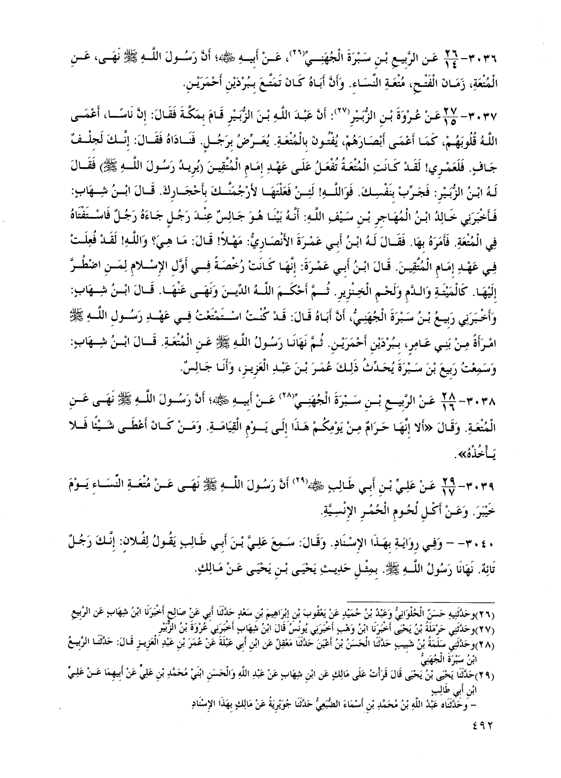 3037 - عن عروة بن الزبير: أن عبد الله بن الزبير قام بمكة فقال: إن ناساً، أعمى الله قلوبهم، كما أعمى أبصارهم، يفتون بالمتعة. يعرض برجل. فناداه فقال: إنك لجلف جاف. فلعمري! لقد كانت المتعة تفعل على عهد إمام المتقين (يريد رسول الله صلى الله عليه وسلم) فقال له ابن الزبير: فجرب بنفسك. فوالله! لئن فعلتها لأرجمنك بأحجارك. قال ابن شهاب: فأخبرني خالد بن المهاجر بن سيف الله: أنه بينا هو جالس عند رجل جاءه رجل فاستفتاه في المتعة. فأمره بها. فقال له ابن أبي عمرة الأنصاري: مهلاً! قال: ما هي؟ والله! لقد فعلت في عهد إمام المتقين. قال ابن أبي عمرة: إنها كانت رخصة في أول الإسلام لمن اضطر إليها. كالميتة والدم ولحم الخنزير. ثم أحكم الله الدين ونهى عنها. قال ابن شهاب: وأخبرني ربيع بن سبرة الجهني، أن أباه قال: قد كنت استمتعت في عهد رسول الله صلى الله عليه وسلم امرأة من بني عامر، ببردين أحمرين. ثم نهانا رسول الله صلى الله عليه وسلم عن المتعة. قال ابن شهاب: وسمعت ربيع بن سبرة يحدث ذلك عمر بن عبد العزيز، وأنا جالس.