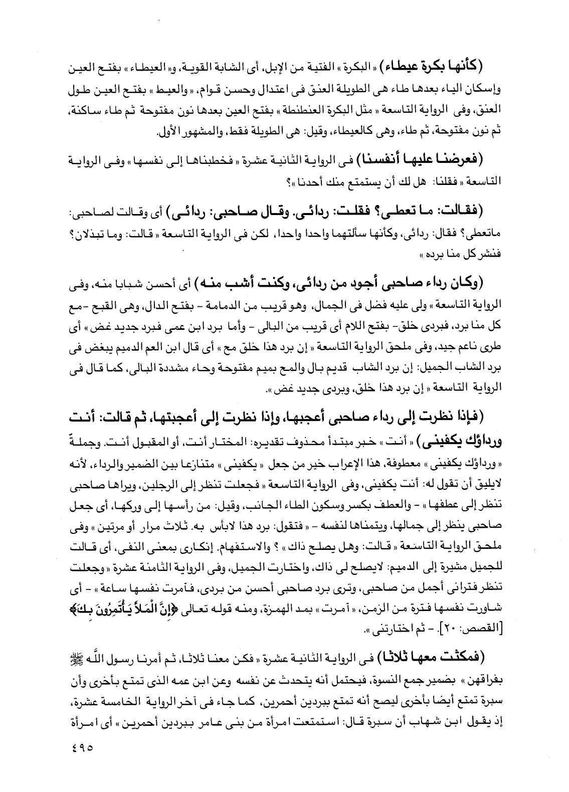 (فإذا نظرت إلى رداء صاحبي أعجبها، وإذا نظرت إلي أعجبتها، ثم قالت: أنت ورداؤك يكفيني) "أنت" خبر مبتدأ محذوف تقديره: المختار أنت، أو المقبول أنت. وجملة "ورداؤك يكفيني" معطوفة، هذا الإعراب خير من جعل "يكفيني" متنازعاً بين الضمير والرداء، لأنه لا يليق أن تقول له: أنت يكفيني، وفي الرواية التاسعة "فجعلت تنظر إلى الرجلين، ويراها صاحبي تنظر إلى عطفها" -والعطف بكسر وسكون الطاء الجانب، وقيل: من رأسها إلى وركها، أي جعل صاحبي ينظر إلى جمالها، ويتمناها لنفسه- "فتقول: برد هذا لا بأس به. ثلاث مرار أو مرتين" وفي ملحق الرواية التاسعة "قالت: وهل يصلح ذاك"؟ والاستفهام. إنكاري بمعنى النفي، أي قالت للجميل مشيرة إلى الدميم: لا يصلح لي ذاك، واختارت الجميل، وفي الرواية الثامنة عشرة "وجعلت تنظر فتراني أجمل من صاحبي، وترى برد صاحبي أحسن من بردي، فآمرت نفسها ساعة" -أي شاورت نفسها فترة من الزمن، "آمرت" بمد الهمزة، ومنه قوله تعالى {إن الملأ يأتمرون بك} [القصص: 20]. - ثم اختارتني".
