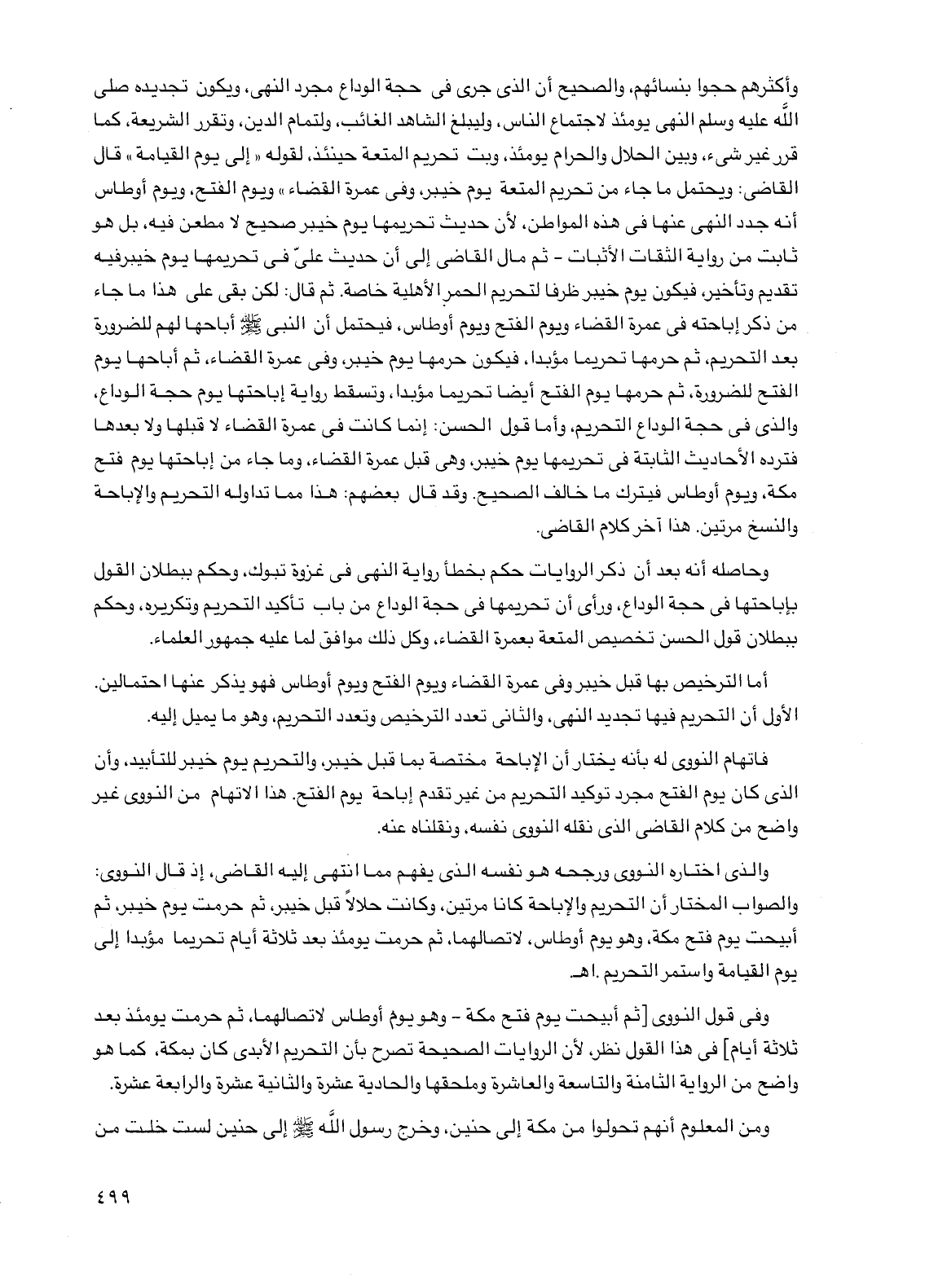 والذي اختاره النووي ورجحه هو نفسه الذي يفهم مما انتهى إليه القاضي، إذ قال النووي: والصواب المختار أن التحريم والإباحة كانا مرتين، وكانت حلالاً قبل خيبر، ثم حرمت يوم خيبر، ثم أبيحت يوم فتح مكة، وهو يوم أوطاس، لاتصالهما، ثم حرمت يومئذ بعد ثلاثة أيام تحريماً مؤبداً إلى يوم القيامة واستمر التحريم. اهـ