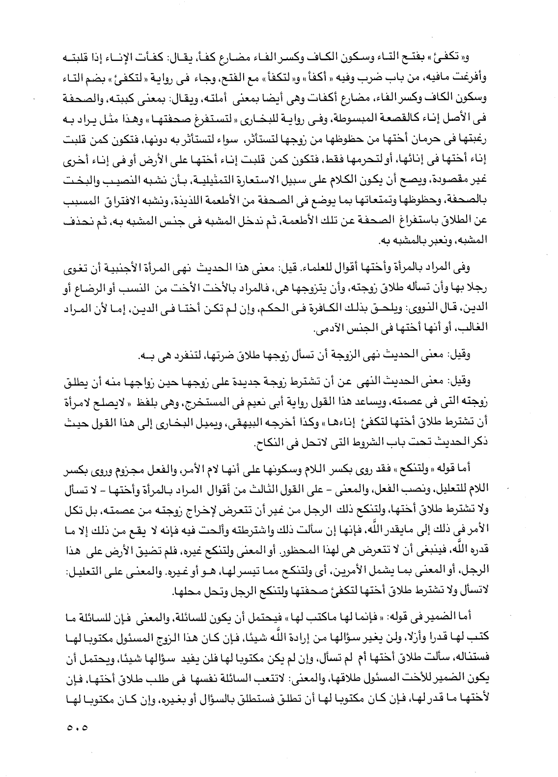أما قوله "ولتنكح" فقد روي بكسر اللام وسكونها على أنها لام الأمر، والفعل مجزوم وروي بكسر اللام للتعليل، ونصب الفعل، والمعنى -على القول الثالث من أقوال المراد بالمرأة وأختها- لا تسأل ولا تشترط طلاق أختها، ولتنكح ذلك الرجل من غير أن تتعرض لإخراج زوجته من عصمته، بل تكل الأمر في ذلك إلى ما يقدر الله، فإنها إن سألت ذلك واشترطته وألحت فيه فإنه لا يقع من ذلك إلا ما قدره الله، فينبغي أن لا تتعرض هي لهذا المحظور. أو المعنى ولتنكح غيره، فلم تضيق الأرض على هذا الرجل، أو المعنى بما يشمل الأمرين، أي ولتنكح مما تيسر لها، هو أو غيره. والمعنى على التعليل: لا تسأل ولا تشترط طلاق أختها لتكفئ صحفتها ولتنكح الرجل وتحل محلها.