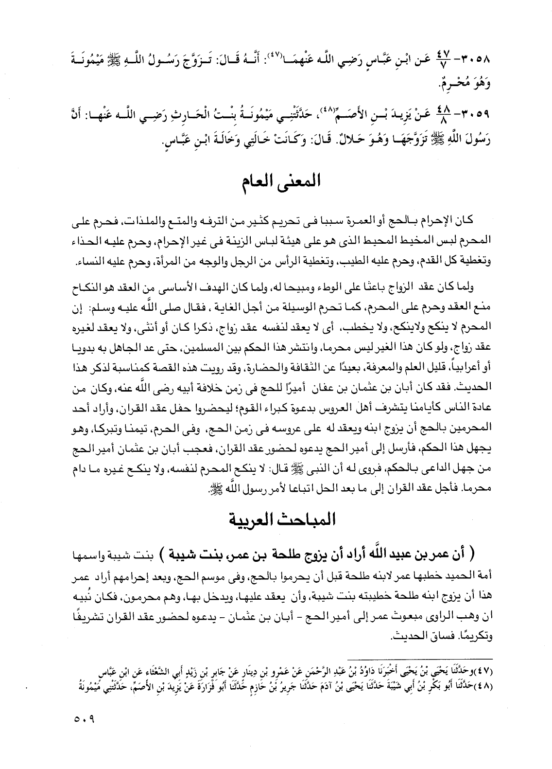 (أن عمر بن عبيد الله أراد أن يزوج طلحة بن عمر، بنت شيبة) بنت شيبة واسمها أمة الحميد خطبها عمر لابنه طلحة قبل أن يحرموا بالحج، وفي موسم الحج، وبعد إحرامهم أراد عمر هذا أن يزوج ابنه طلحة خطيبته بنت شيبة، وأن يعقد عليها، ويدخل بها، وهم محرمون، فكان نبيه أن وهب الراوي مبعوث عمر إلى أمير الحج -أبان بن عثمان- يدعوه لحضور عقد القران تشريفاً وتكريماً. فساق الحديث.
