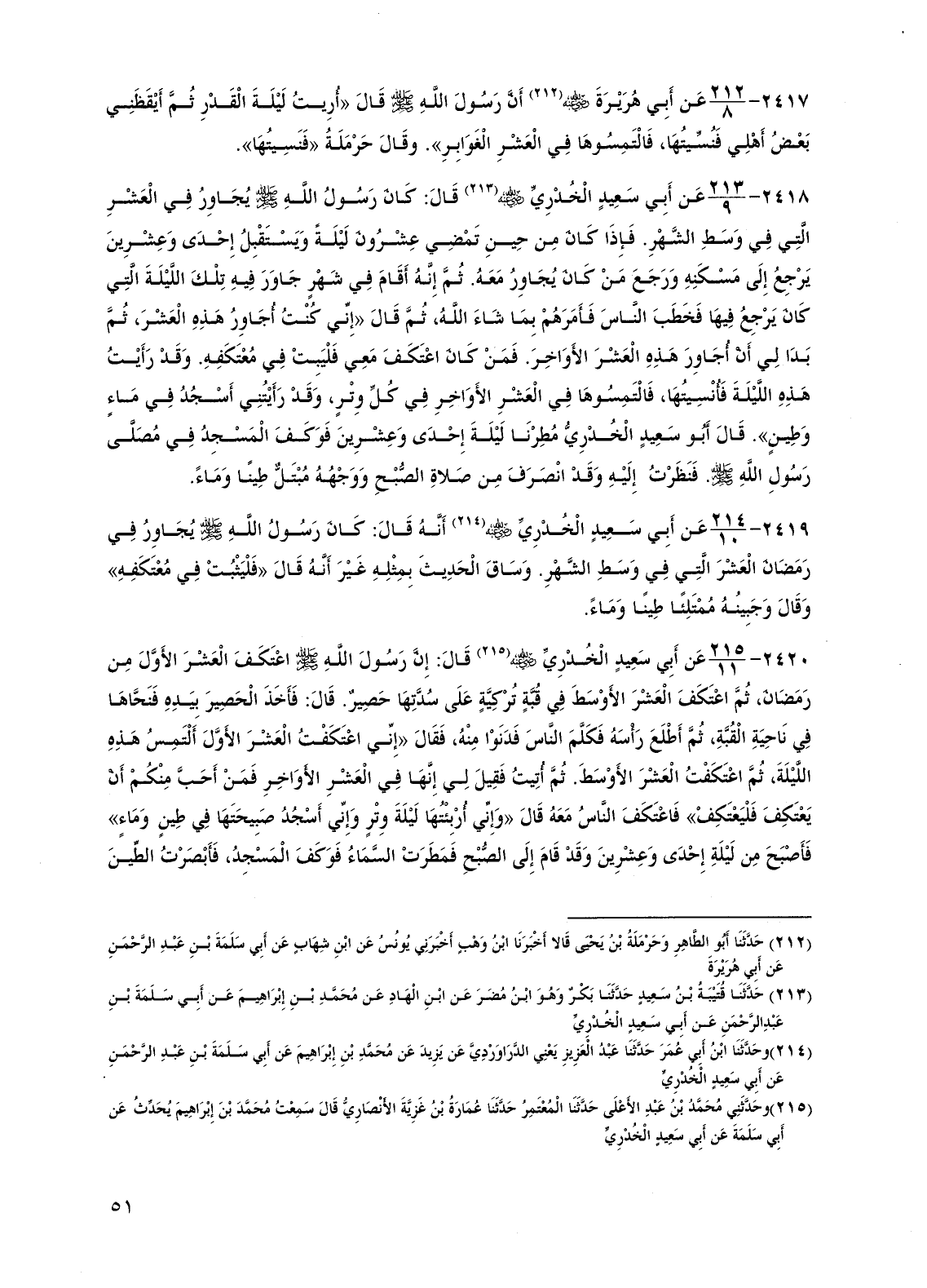 2420 - عن أبي سعيد الخدري رضي الله عنه قال: إن رسول الله صلى الله عليه وسلم اعتكف العشر الأول من رمضان، ثم اعتكف العشر الأوسط في قبة تركية على سدتها حصير. قال: فأخذ الحصير بيده فنحاها في ناحية القبلة، ثم أطلع رأسه فكلم الناس فدنوا منه، فقال "إني اعتكفت العشر الأول ألتمس هذه الليلة، ثم اعتكفت العشر الأوسط. ثم أتيت فقيل لي إنها في العشر الأواخر فمن أحب منكم أن يعتكف فليعتكف" فاعتكف الناس معه قال "وإني أربئتها ليلة وتر وإني أسجد صبيحتها في طين وماء" فأصبح من ليلة إحدى وعشرين وقد قام إلى الصبح فمطرت السماء فوكف المسجد، فأبصرت الطين