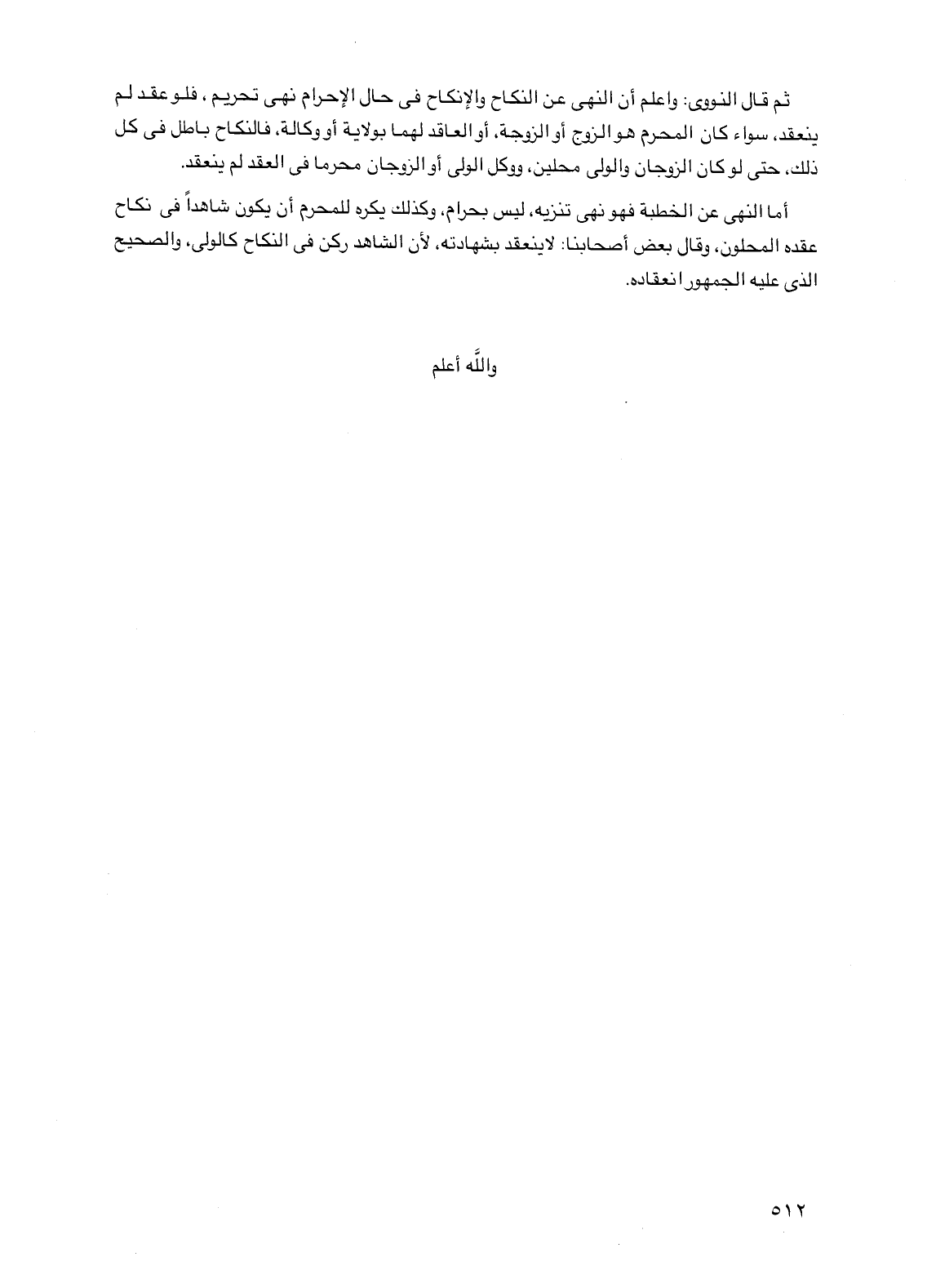 ثم قال النووي: واعلم أن النهي عن النكاح والإنكاح في حال الإحرام نهي تحريم، فلو عقد لم ينعقد، سواء كان المحرم هو الزوج أو الزوجة، أو العاقد لهما بولاية أو وكالة، فالنكاح باطل في كل ذلك، حتى لو كان الزوجان والولي محلين، ووكل الولي أو الزوجان محرماً في العقد لم ينعقد.