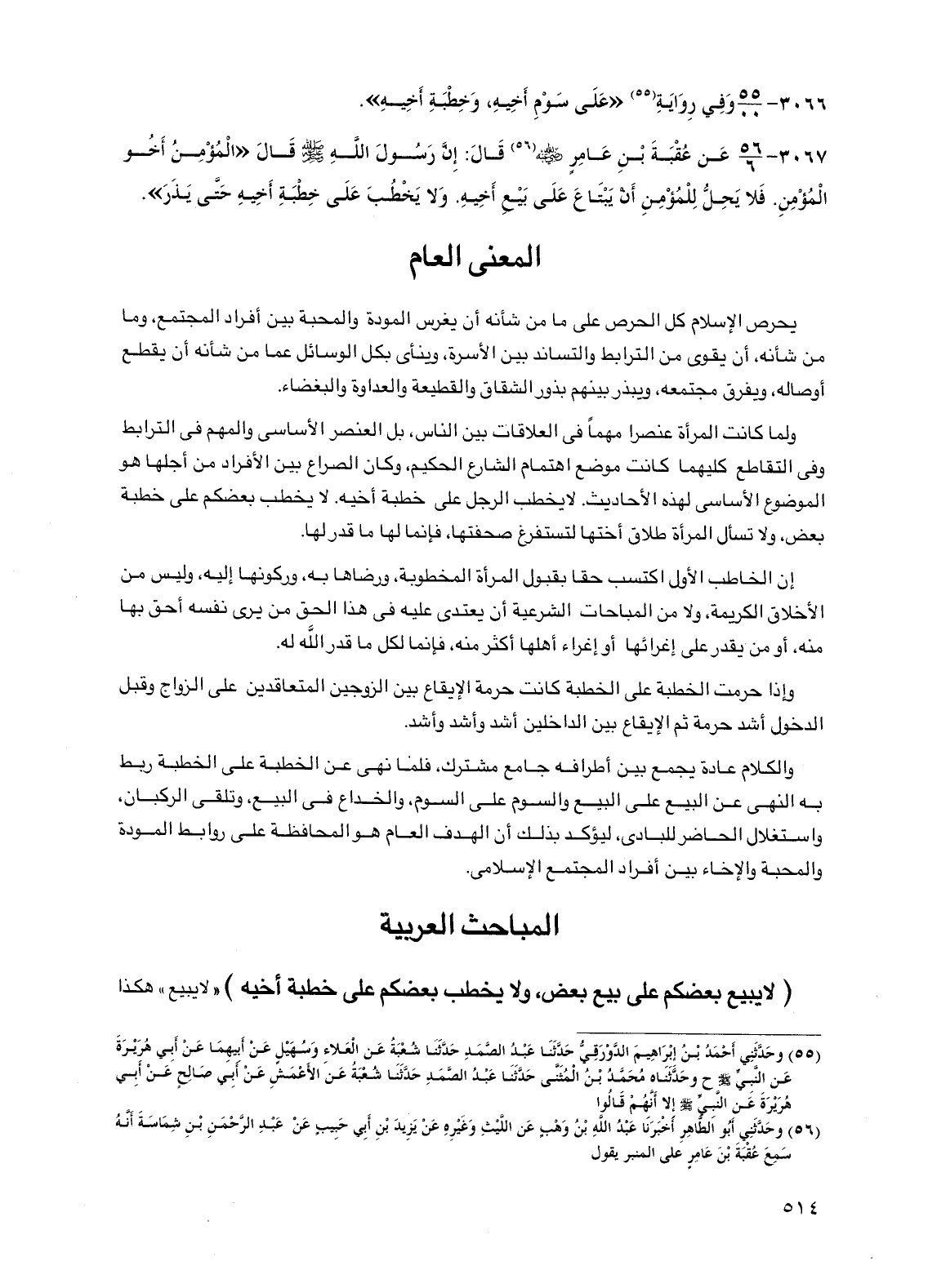 3067 - عن عقبة بن عامر رضي الله عنه قال: إن رسول الله صلى الله عليه وسلم قال "المؤمن أخو المؤمن. فلا يحل للمؤمن أن يبتاع على بيع أخيه. ولا يخطب على خطبة أخيه حتى يذر".