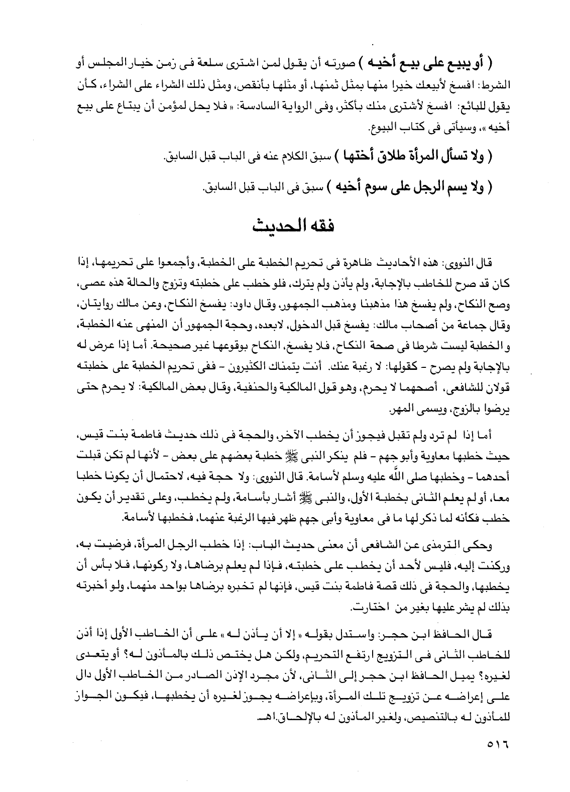 قال النووي: هذه الأحاديث ظاهرة في تحريم الخطبة على الخطبة، وأجمعوا على تحريمها، إذا كان قد صرح للخاطب بالإجابة، ولم يأذن ولم يترك، فلو خطب على خطبته وتزوج والحالة هذه عصى، وصح النكاح، ولم يفسخ هذا مذهبنا ومذهب الجمهور، وقال داود: يفسخ النكاح، وعن مالك روايتان، وقال جماعة من أصحاب مالك: يفسخ قبل الدخول، لا بعده، وحجة الجمهور أن المنهي عنه الخطبة، والخطبة ليست شرطاً في صحة النكاح، فلا يفسخ، النكاح بوقوعها غير صحيحة. أما إذا عرض له بالإجابة ولم يصرح -كقولها: لا رغبة عنك. أنت يتمناك الكثيرون-ففي تحريم الخطبة على خطبته قولان للشافعي، أصحهما لا يحرم، وهو قول المالكية والحنفية، وقال بعض المالكية: لا يحرم حتى يرضوا بالزوج، ويسمى المهر.