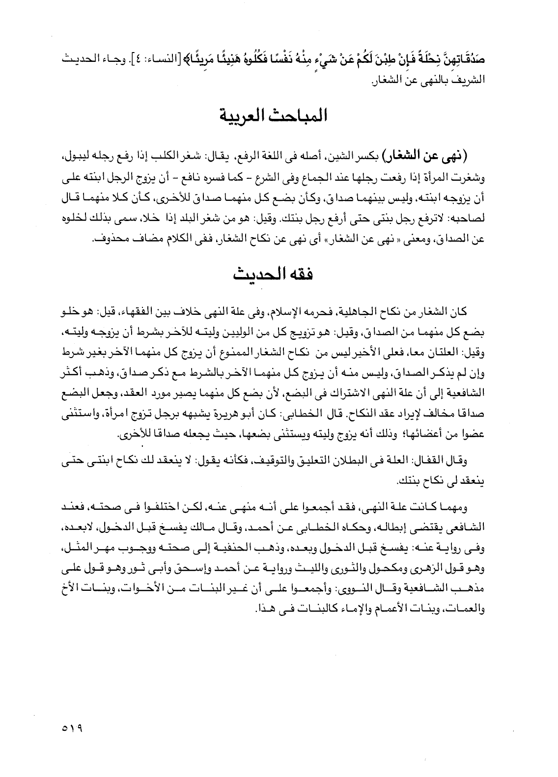 صدقاتهن نحلة فإن طبن لكم عن شيء منه نفساً فكلوه هنيئاً مريئاً} [النساء: 4]. وجاء الحديث الشريف بالنهي عن الشغار.