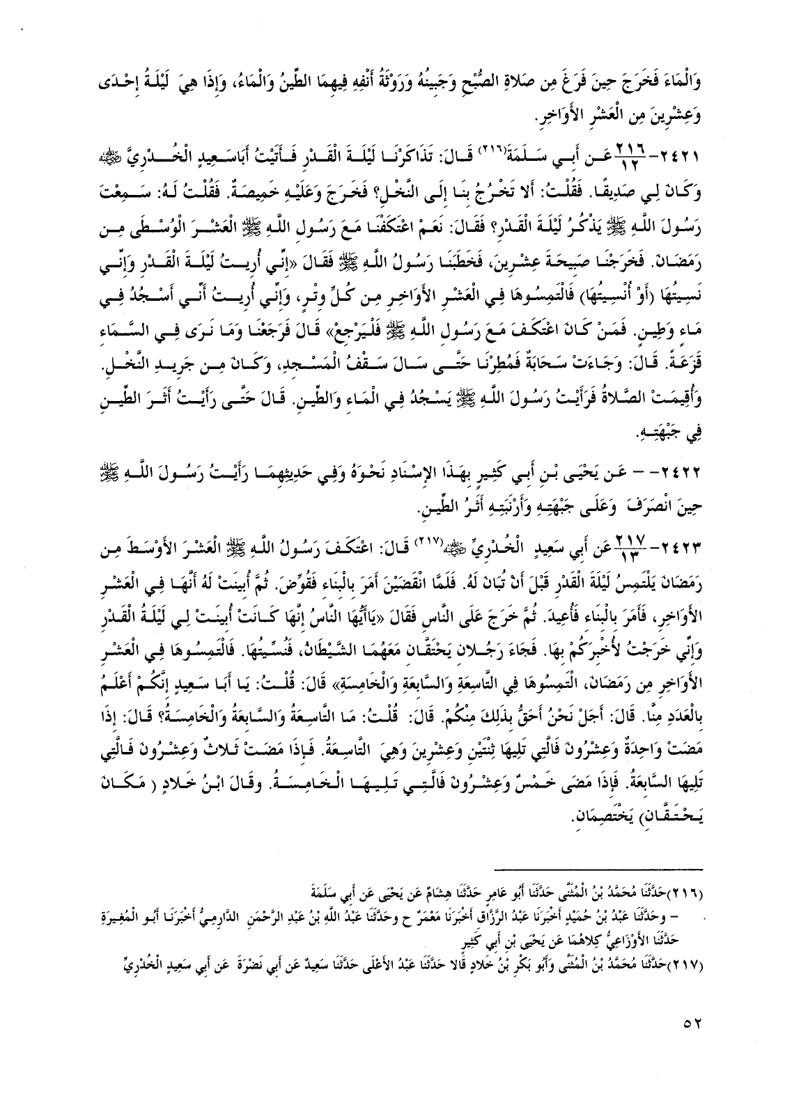 2423 - عن أبي سعيد الخدري رضي الله عنه قال: اعتكف رسول الله صلى الله عليه وسلم العشر الأوسط من رمضان يلتمس ليلة القدر قبل أن تبان له. فلما انقضين أمر بالبناء فقوض. ثم أبينت له أنها في العشر الأواخر، فأمر بالبناء فأعيد. ثم خرج على الناس فقال "يا أيها الناس إنها كانت أبينت لي ليلة القدر وإني خرجت لأخبركم بها. فجاء رجلان يحتقان معهما الشيطان، فنسيتها. فالتمسوها في العشر الأواخر من رمضان، التمسوها في التاسعة والسابعة والخامسة" قال: قلت: يا أبا سعيد إنكم أعلم بالعدد منا. قال: أجل نحن أحق بذلك منكم. قال: قلت: ما التاسعة والسابعة والخامسة؟ قال: إذا مضت واحدة وعشرون فالتي تليها ثنتين وعشرين وهي التاسعة. فإذا مضت ثلاث وعشرون فالتي تليها السابعة. فإذا مضى خمس وعشرون فالتي تليها الخامسة. وقال ابن خلاد (مكان يحتقان) يختصمان.