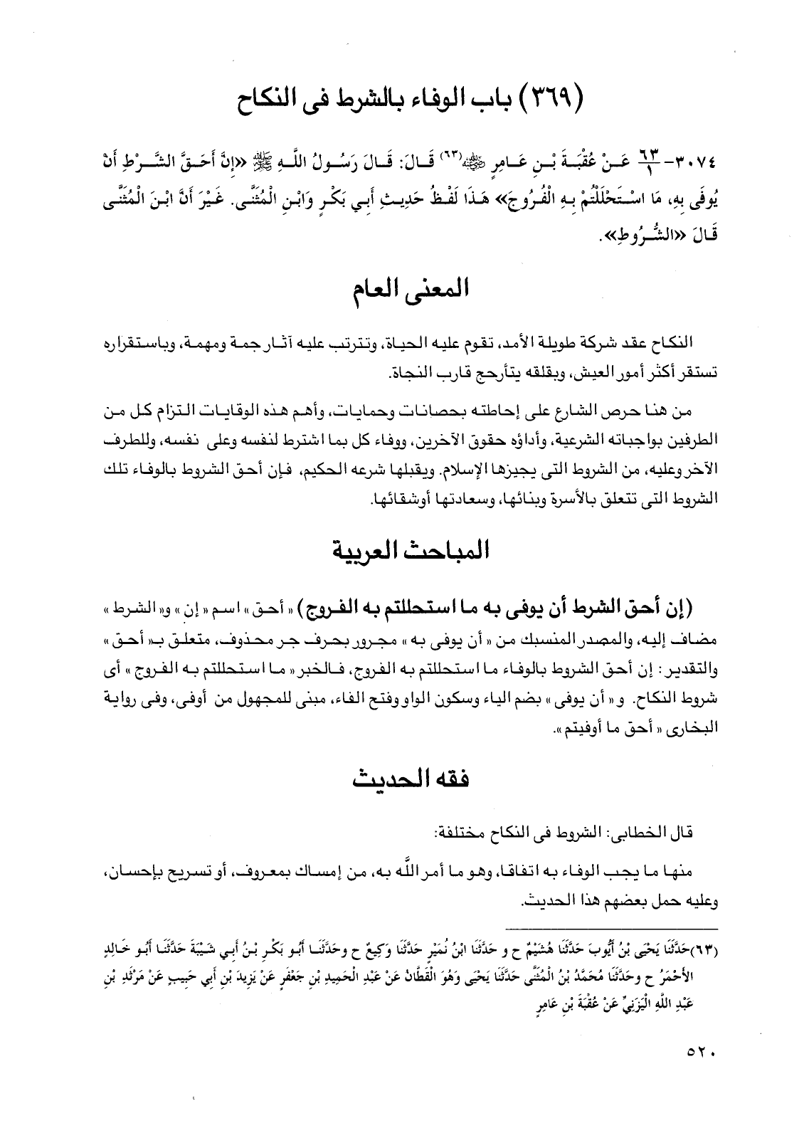 3074 - عن عقبة بن عامر رضي الله عنه قال: قال رسول الله صلى الله عليه وسلم "إن أحق الشرط أن يوفى به، ما استحللتم به الفروج" هذا لفظ حديث أبي بكر وابن المثنى. غير أن ابن المثنى قال "الشروط".