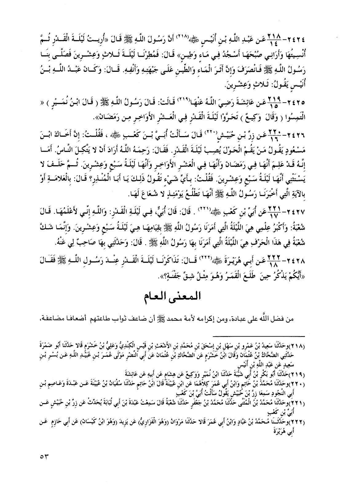 2426 - عن زر بن حبيش قال سألت أبي بن كعب رضي الله عنه، فقلت: إن أخاك ابن مسعود يقول من يقم الحول يصب ليلة القدر. فقال: رحمه الله أراد أن لا يتكل الناس. أما إنه قد علم أنها في رمضان وأنها في العشر الأواخر وأنها ليلة سبع وعشرين. ثم حلف لا يستثني أنها ليلة سبع وعشرين. فقلت: بأي شيء تقول ذلك يا أبا المنذر؟ قال: بالعلامة أو بالآية التي أخبرنا رسول الله صلى الله عليه وسلم أنها تطلع يومئذ لا شعاع لها.