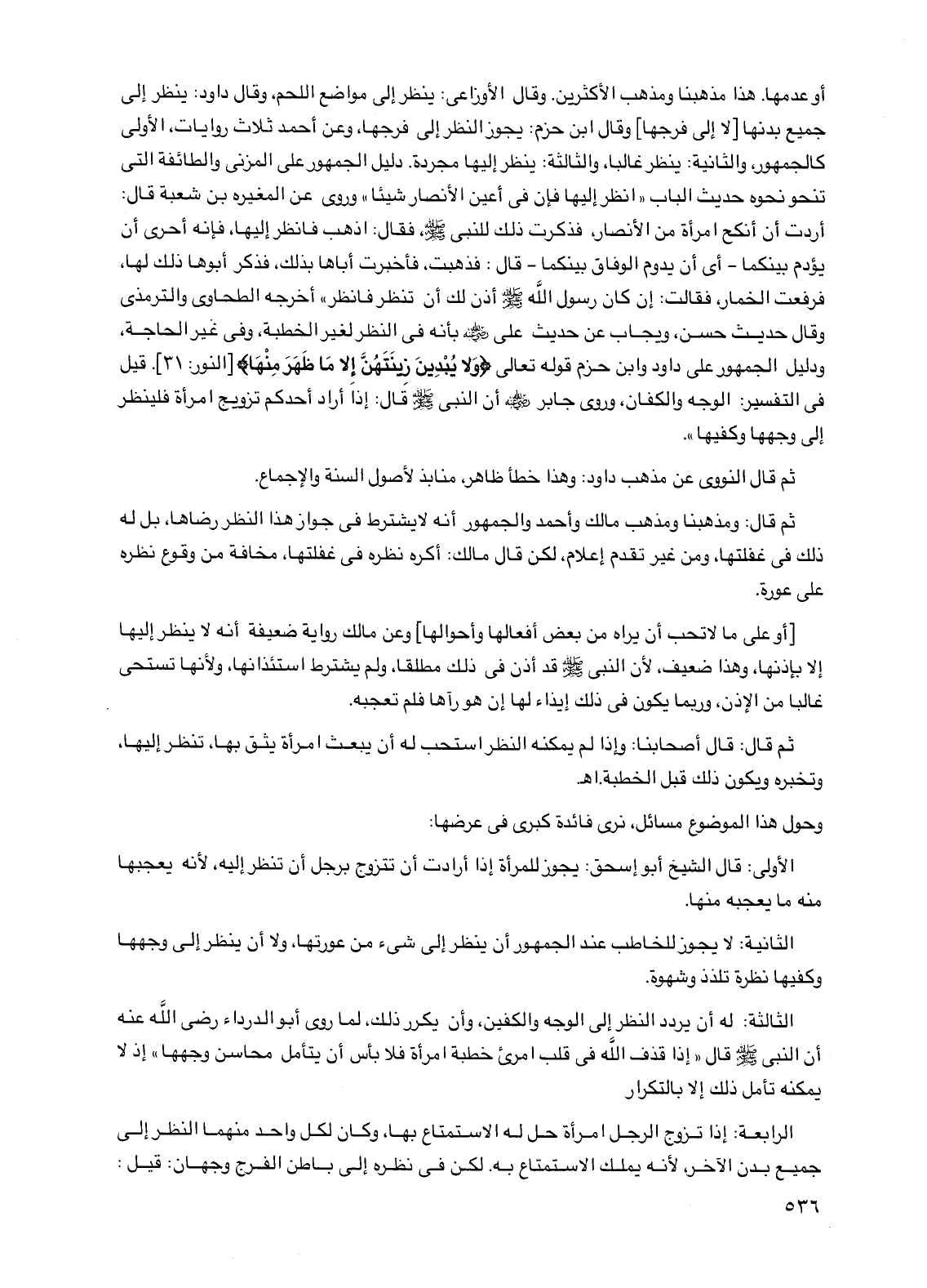 أو عدمها. هذا مذهبنا ومذهب الأكثرين. وقال الأوزاعي: ينظر إلى مواضع اللحم، وقال داود: ينظر إلى جميع بدنها [لا إلى فرجها] وقال ابن حزم: يجوز النظر إلى فرجها، وعن أحمد ثلاث روايات، الأولى كالجمهور، والثانية: ينظر غالباً، والثالثة: ينظر إليها مجردة. دليل الجمهور على المزني والطائفة التي تنحو نحوه حديث الباب "انظر إليها فإن في أعين الأنصار شيئاً" وروي عن المغيرة بن شعبة قال: أردت أن أنكح امرأة من الأنصار، فذكرت ذلك للنبي صلى الله عليه وسلم، فقال: اذهب فانظر إليها، فإنه أحرى أن يؤدم بينكما -أي أن يدوم الوفاق بينكما- قال: فذهبت، فأخبرت أباها بذلك، فذكر أبوها ذلك لها، فرفعت الخمار، فقالت: إن كان رسول الله صلى الله عليه وسلم أذن لك أن تنظر فانظر" أخرجه الطحاوي والترمذي وقال حديث حسن، ويجاب عن حديث علي رضي الله عنه بأنه في النظر لغير الخطبة، وفي غير الحاجة، ودليل الجمهور على داود وابن حزم قوله تعالى {ولا يبدين زينتهن إلا ما ظهر منها} [النور: 31].