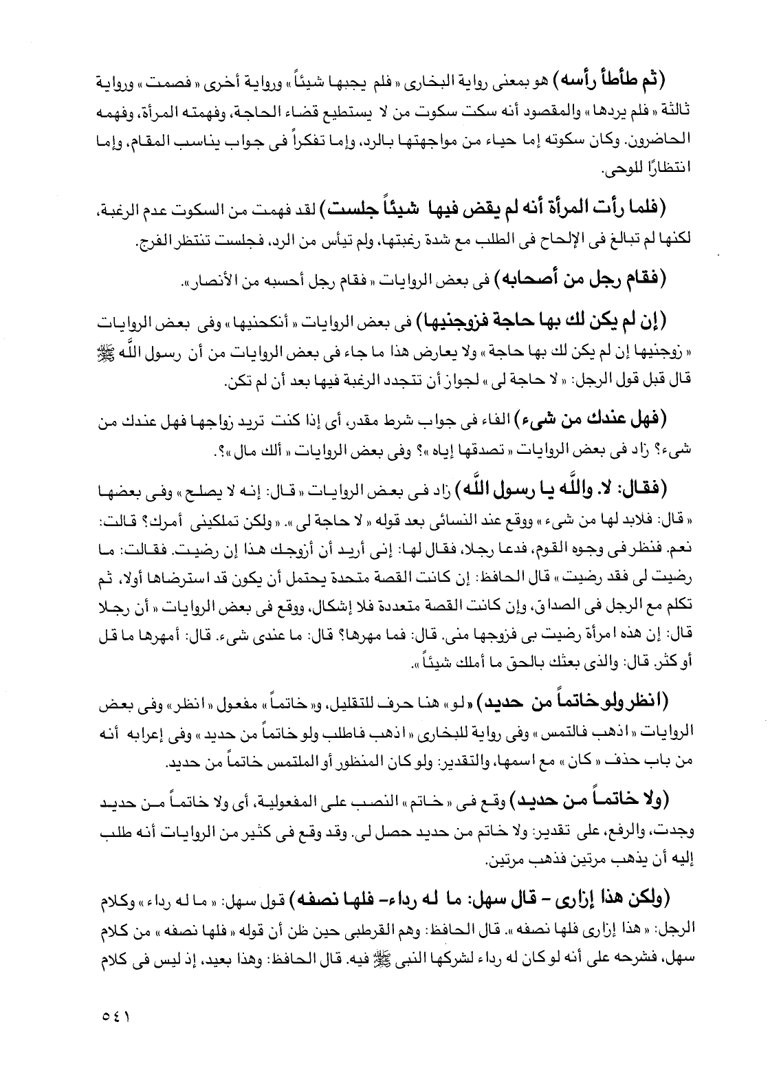 (انظر ولو خاتماً من حديد) "لو" هنا حرف للتقليل، و"خاتماً" مفعول "انظر" وفي بعض الروايات "اذهب فالتمس" وفي رواية للبخاري "اذهب فاطلب ولو خاتماً من حديد" وفي إعرابه أنه من باب حذف "كان" مع اسمها، والتقدير: ولو كان المنظور أو الملتمس خاتماً من حديد.