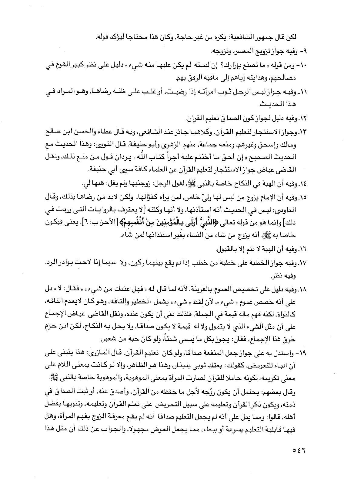 19 - واستدل به على جواز جعل المنفعة صداقاً، ولو كان تعليم القرآن. قال المازري: هذا ينبني على أن الباء للتعويض، كقولك: بعتك ثوبي بدينار، وهذا هو الظاهر، وإلا لو كانت بمعنى اللام على معنى تكريمه، لكونه حاملاً للقرآن لصارت المرأة بمعنى الموهوبة، والموهوبة خاصة بالنبي صلى الله عليه وسلم. وقال بعضهم: يحتمل أن يكون زوجه لأجل ما حفظه من القرآن، وأصدق عنه، أو ثبت الصداق في ذمته، ويكون ذكر القرآن وتعليمه على سبيل التحريض على تعلم القرآن وتعليمه، وتنويهاً بفضل أهله، قالوا: ومما يدل على أنه لم يجعل التعليم صداقاً أنه لم يقع معرفة الزوج بفهم المرأة، وهل فيها قابلية التعليم بسرعة أو ببطء، مما يجعل العوض مجهولاً، والجواب عن ذلك أن مثل هذا