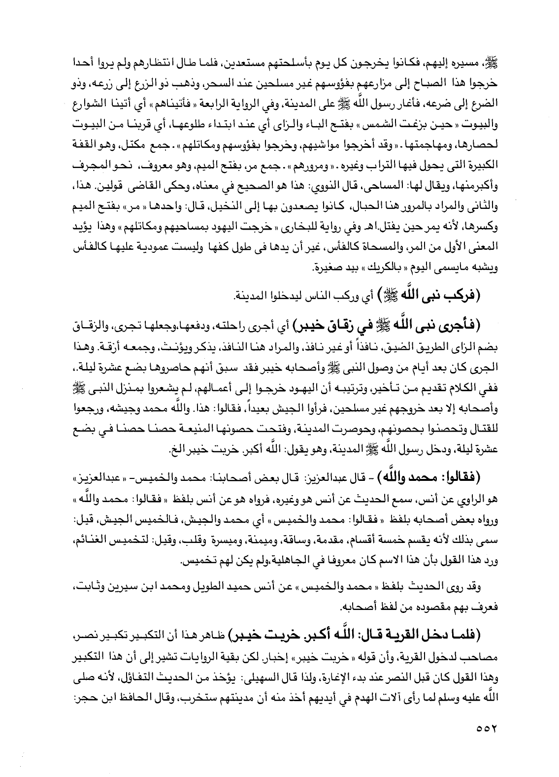 صلى الله عليه وسلم، مسيره إليهم، فكانوا يخرجون كل يوم بأسلحتهم مستعدين، فلما طال انتظارهم ولم يروا أحداً خرجوا هذا الصباح إلى مزارعهم بفؤوسهم غير مسلحين عند السحر، وذهب ذو الزرع إلى زرعه، وذو الضرع إلى ضرعه، فأغار رسول الله صلى الله عليه وسلم على المدينة، وفي الرواية الرابعة "فأتيناهم" أي أتينا الشوارع والبيوت "حين بزغت الشمس" بفتح الباء والزاي أي عند ابتداء طلوعها، أي قربنا من البيوت لحصارها، ومهاجمتها. "وقد أخرجوا مواشيهم، وخرجوا بفؤوسهم ومكاتلهم" -جمع مكتل، وهو القفة الكبيرة التي يحول فيها التراب وغيره- "ومرورهم"- جمع مر، بفتح الميم، وهو معروف، نحو المجرف وأكبر منها، ويقال لها: المساحي، قال النووي: هذا هو الصحيح في معناه، وحكى القاضي قولين. هذا، والثاني والمراد بالمرور هنا الحبال، كانوا يصعدون بها إلى النخيل، قال: واحدها "مر" بفتح الميم وكسرها، لأنه يمر حين يفتل. اهـ وفي رواية للبخاري "خرجت اليهود بمساحيهم ومكاتلهم" وهذا يؤيد المعنى الأول من المر، والمسحاة كالفأس، غير أن يدها في طول كفها وليست عمودية عليها كالفأس ويشبه ما يسمى اليوم "بالكريك" بيد صغيرة.