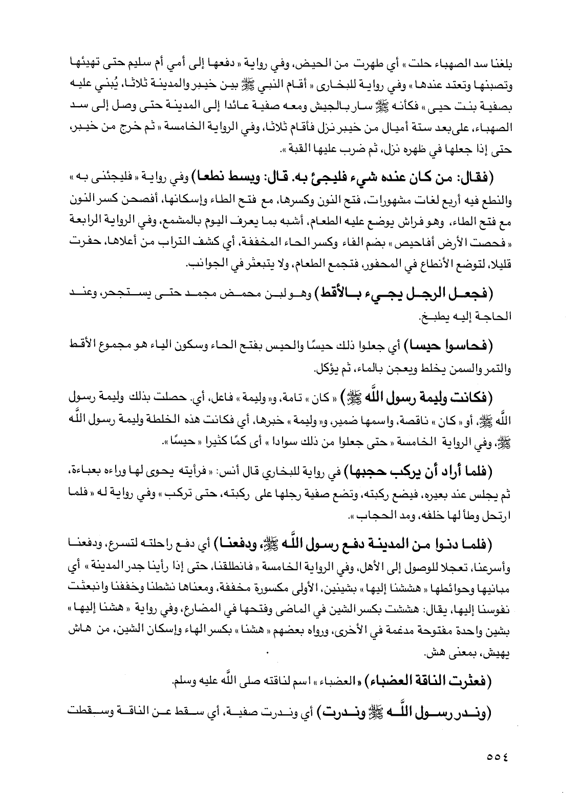 بلغنا سد الصهباء حلت" أي طهرت من الحيض، وفي رواية "دفعها إلى أمي أم سليم حتى تهيئها وتصبنها وتعتد عندها" وفي رواية للبخاري "أقام النبي صلى الله عليه وسلم بين خيبر والمدينة ثلاثاً، يبني عليه بصفية بنت حيي" فكأنه صلى الله عليه وسلم سار بالجيش ومعه صفية عائداً إلى المدينة حتى وصل إلى سد الصهباء، على بعد ستة أميال من خيبر نزل فأقام ثلاثاً، وفي الرواية الخامسة "ثم خرج من خيبر، حتى إذا جعلها في ظهره نزل، ثم ضرب عليها القبة".
