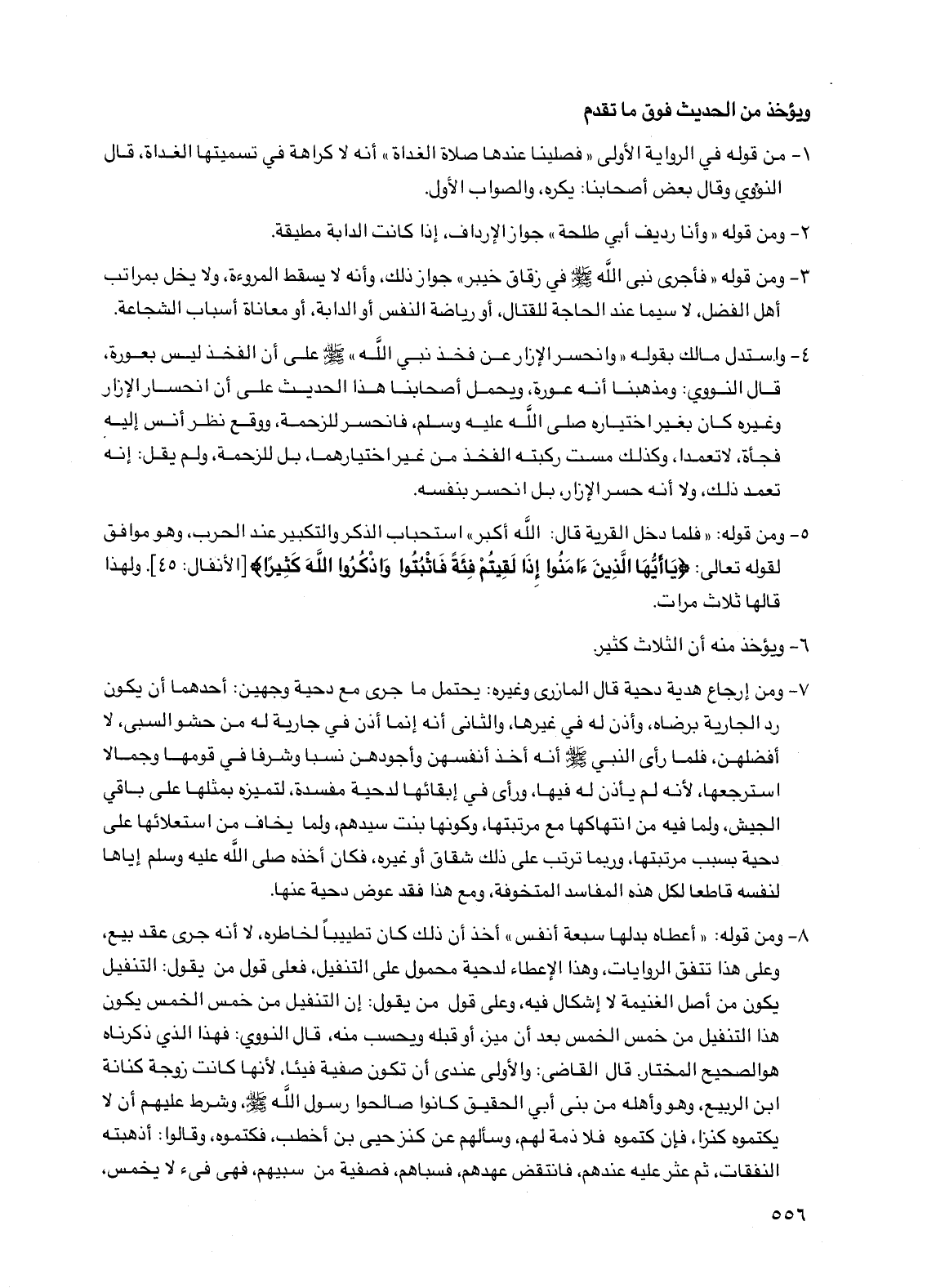 8 - ومن قوله: "أعطاه بدلها سبعة أنفس" أخذ أن ذلك كان تطييباً لخاطره، لا أنه جرى عقد بيع، وعلى هذا تتفق الروايات، وهذا الإعطاء لدحية محمول على التنفيل، فعلى قول من يقول: التنفيل يكون من أصل الغنيمة لا إشكال فيه، وعلى قول من يقول: إن التنفيل من خمس الخمس يكون هذا التنفيل من خمس الخمس بعد أن ميز، أو قبله ويحسب منه، قال النووي: فهذا الذي ذكرناه هو الصحيح المختار. قال القاضي: والأولى عندي أن تكون صفية فيئاً، لأنها كانت زوجة كنانة بن الربيع، وهو وأهله من بني أبي الحقيق كانوا صالحوا رسول الله صلى الله عليه وسلم، وشرط عليهم أن لا يكتموه كنزاً، فإن كتموه فلا ذمة لهم، وسألهم عن كنز حيي بن أخطب، فكتموه، وقالوا: أذهبته النفقات، ثم عثر عليه عندهم، فانتقض عهدهم، فسباهم، فصفية من سبيهم، فهي فيء لا يخمس،