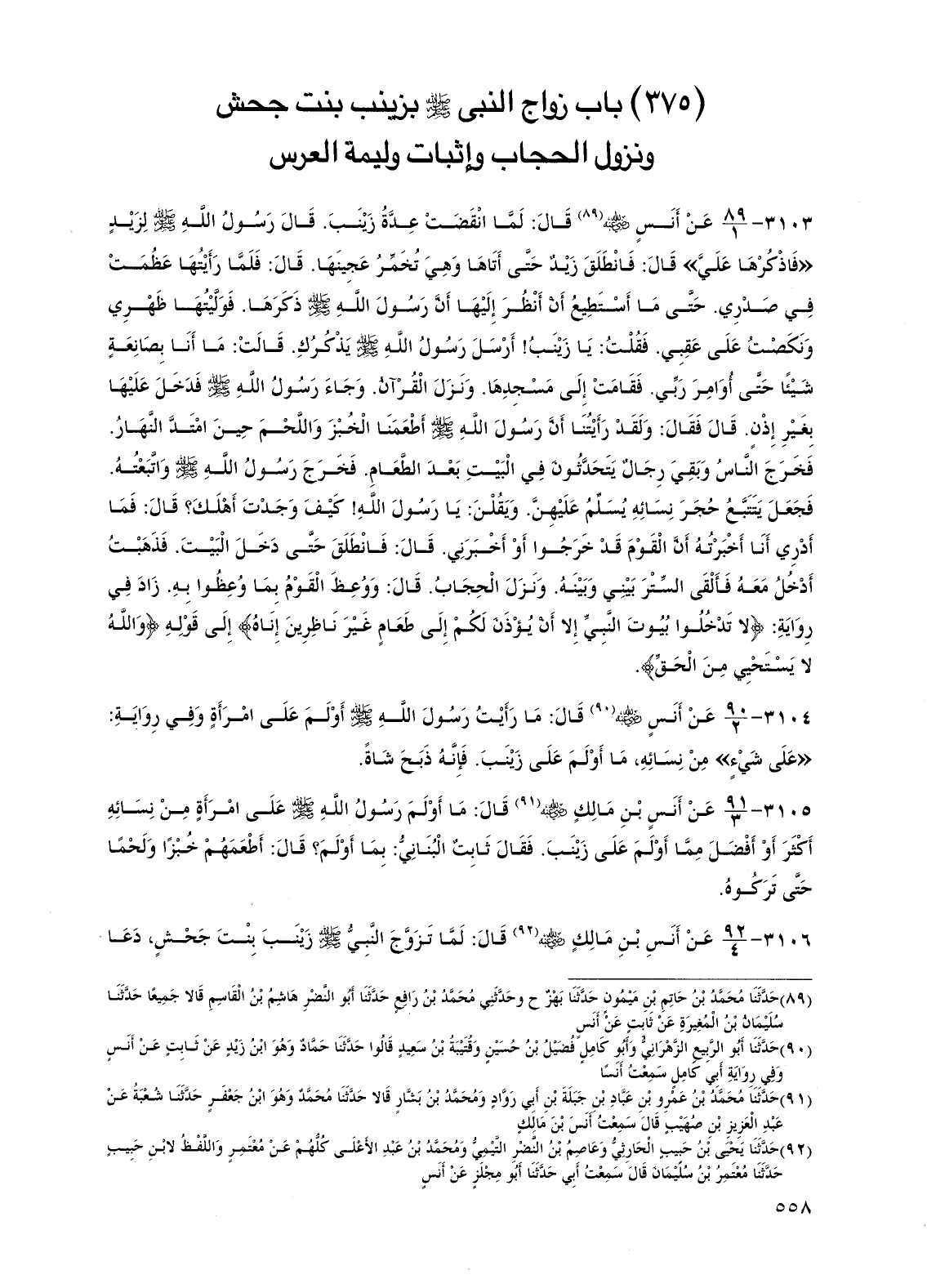 (375) باب زواج النبي صلى الله عليه وسلم بزينب بنت جحش ونزول الحجاب وإثبات وليمة العرس