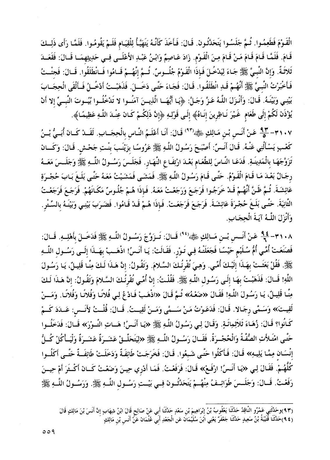 3107 - عن أنس بن مالك رضي الله عنه قال: أنا أعلم الناس بالحجاب. لقد كان أبي بن كعب يسألني عنه. قال أنس: أصبح رسول الله صلى الله عليه وسلم عروساً بزينب بنت جحش. قال: وكان تزوجها بالمدينة. فدعا الناس للطعام بعد ارتفاع النهار. فجلس رسول الله صلى الله عليه وسلم وجلس معه رجال بعد ما قام القوم. حتى قام رسول الله صلى الله عليه وسلم. فمشى فمشيت معه حتى بلغ باب حجرة عائشة. ثم ظن أنهم قد خرجوا فرجع ورجعت معه. فإذا هم جلوس مكانهم. فرجع فرجعت الثانية حتى بلغ حجرة عائشة فرجع فرجعت. فإذا هم قد قاموا. فضرب بيني وبينه بالستر. وأنزل الله آية الحجاب.