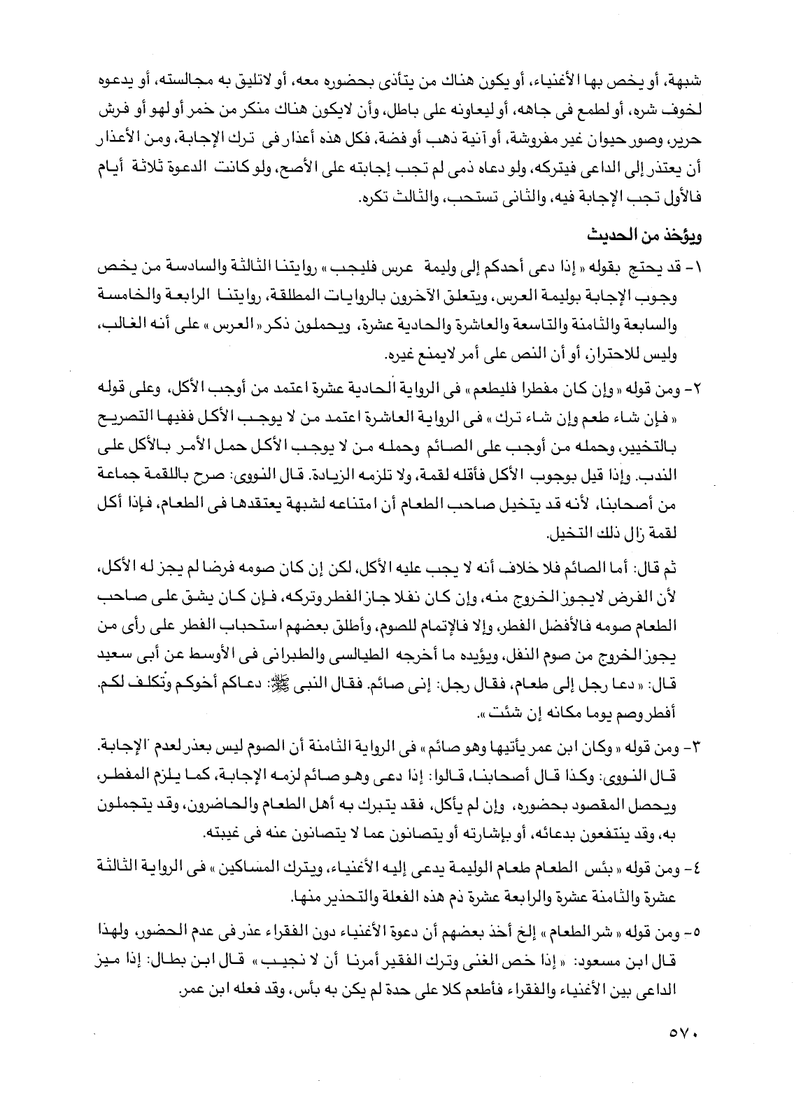 4 - ومن قوله "بئس الطعام طعام الوليمة يدعى إليه الأغنياء، ويترك المساكين" في الرواية الثالثة عشرة والثامنة عشرة والرابعة عشرة ذم هذه الفعلة والتحذير منها.