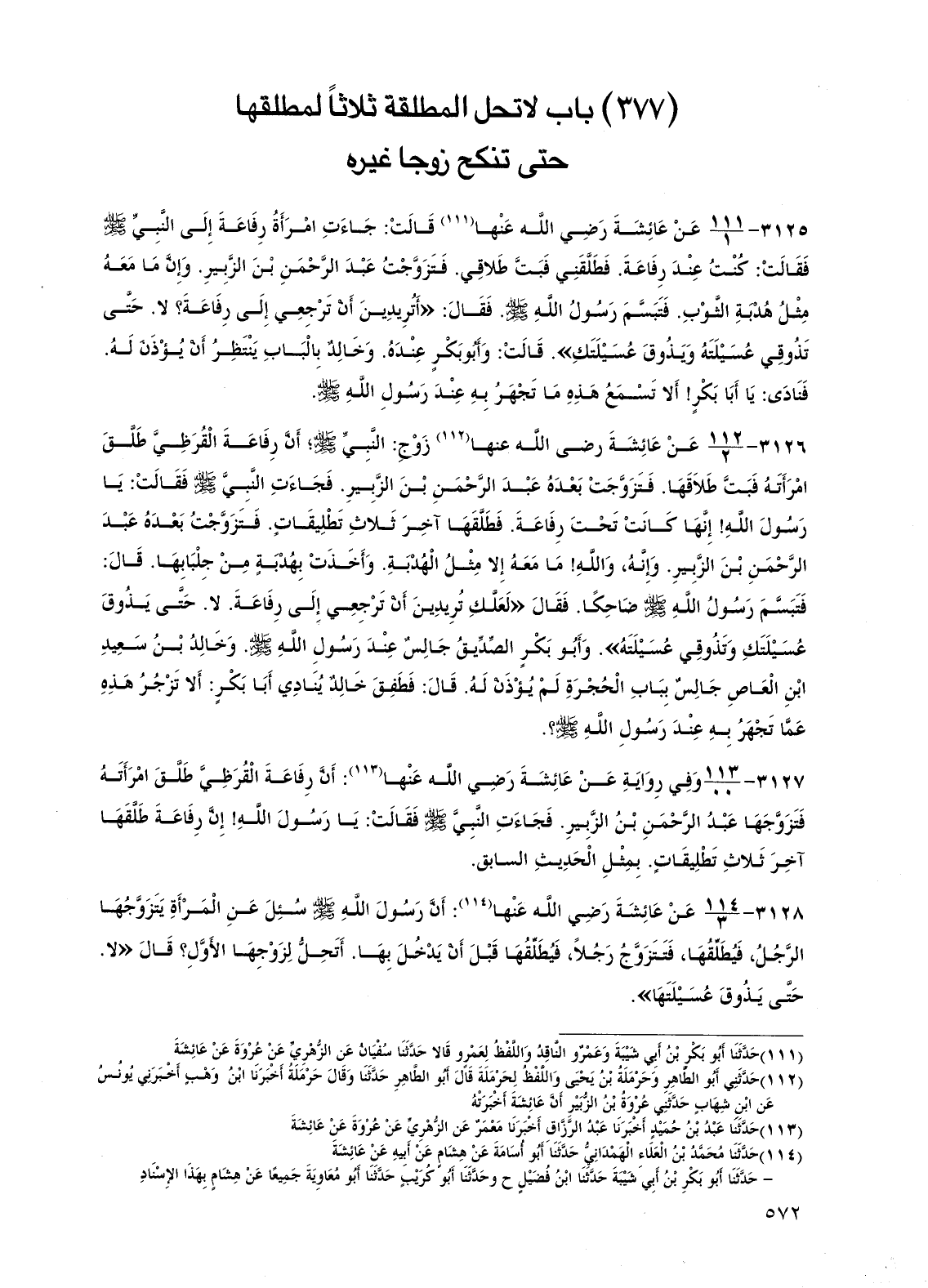 3126 - عن عائشة رضي الله عنها زوج: النبي صلى الله عليه وسلم؛ أن رفاعة القرظي طلق امرأته فبت طلاقها. فتزوجت بعده عبد الرحمن بن الزبير. فجاءت النبي صلى الله عليه وسلم فقالت: يا رسول الله! إنها كانت تحت رفاعة. فطلقها آخر ثلاث تطليقات. فتزوجت بعده عبد الرحمن بن الزبير. وإنه، والله! ما معه إلا مثل الهدبة. وأخذت بهدبة من جلبابها. قال: فتبسم رسول الله صلى الله عليه وسلم ضاحكاً. فقال "لعلك تريدين أن ترجعي إلى رفاعة. لا. حتى يذوق عسيلتك وتذوقي عسيلته". وأبو بكر الصديق جالس عند رسول الله صلى الله عليه وسلم. وخالد بن سعيد بن العاص جالس بباب الحجرة لم يؤذن له. قال: فطفق خالد ينادي أبا بكر: ألا تزجر هذه عما تجهر به عند رسول الله صلى الله عليه وسلم؟ .