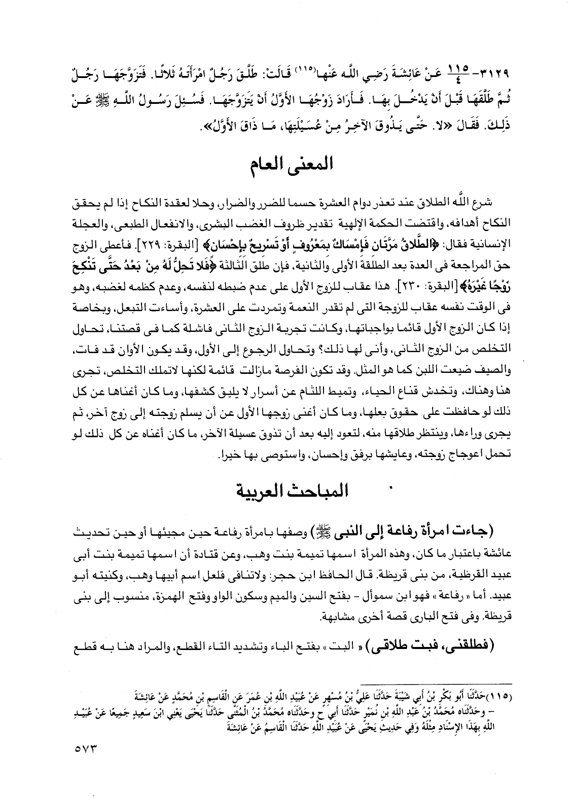 شرع الله الطلاق عند تعذر دوام العشرة حسماً للضرر والضرار، وحلاً لعقدة النكاح إذا لم يحقق النكاح أهدافه، واقتضت الحكمة الإلهية تقدير ظروف الغضب البشري، والانفعال الطبعي، والعجلة الإنسانية فقال: {الطلاق مرتان فإمساك بمعروف أو تسريح بإحسان} [البقرة: 229]. فأعطى الزوج حق المراجعة في العدة بعد الطلقة الأولى والثانية، فإن طلق الثالثة {فلا تحل له من بعد حتى تنكح زوجاً غيره} [البقرة: 230]. هذا عقاب للزوج الأول على عدم ضبطه لنفسه، وعدم كظمه لغضبه، وهو في الوقت نفسه عقاب للزوجة التي لم تقدر النعمة وتمردت على العشرة، وأساءت التبعل، وبخاصة إذا كان الزوج الأول قائماً بواجباتها، وكانت تجربة الزوج الثاني فاشلة كما في قصتنا، تحاول التخلص من الزوج الثاني، وأنى لها ذلك؟ وتحاول الرجوع إلى الأول، وقد يكون الأوان قد فات، والصيف ضيعت اللبن كما هو المثل. وقد تكون الفرصة مازالت قائمة لكنها لا تملك التخلص، تجري هنا وهناك، وتخدش قناع الحياء، وتميط اللثام عن أسرار لا يليق كشفها، وما كان أغناها عن كل ذلك لو حافظت على حقوق بعلها، وما كان أغنى زوجها الأول عن أن يسلم زوجته إلى زوج آخر، ثم يجري وراءها، وينتظر طلاقها منه، لتعود إليه بعد أن تذوق عسيلة الآخر، ما كان أغناه عن كل ذلك لو تحمل اعوجاج زوجته، وعايشها برفق وإحسان، واستوصى بها خيراً.