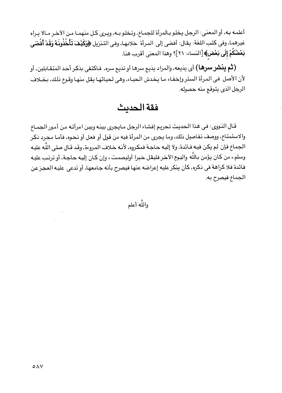 قال النووي: في هذا الحديث تحريم إفشاء الرجل ما يجرى بينه وبين امرأته من أمور الجماع والاستمتاع، ووصف تفاصيل ذلك، وما يجري من المرأة فيه من قول أو فعل أو نحوه، فأما مجرد ذكر الجماع فإن لم يكن فيه فائدة، ولا إليه حاجة فمكروه، لأنه خلاف المروءة، وقد قال صلى الله عليه وسلم "من كان يؤمن بالله واليوم الآخر فليقل خيراً أو ليصمت" وإن كان إليه حاجة، أو ترتب عليه فائدة فلا كراهة في ذكره، كأن ينكر عليه إعراضه عنها فيصرح بأنه جامعها، أو تدعي عليه العجز عن الجماع فيصرح به.