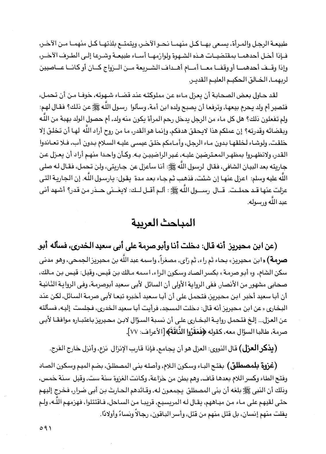 لقد حاول بعض الصحابة أن يعزل ماءه عن مملوكته عند قضاء شهوته، خوفاً من أن تحمل، فتصير أم ولد يحرم بيعها، وترفعاً أن يصبح ولده ابن أمة، وسألوا رسول الله صلى الله عليه وسلم عن ذلك؟ فقال لهم: ولم تفعلون ذلك؟ هل كل ماء من الرجل يدخل رحم المرأة يكون منه ولد، أم حصول الولد بهبة من الله وبقضائه وقدرته؟ إن عملكم هذا لا يحقق هدفكم، وإنما هو القدر، ما من روح أراد الله لها أن تخلق إلا خلقت، ولو شاء لخلقها بدون ماء الرجل، وأمامكم خلق عيسى عليه السلام بدون أب، فلا تعاندوا القدر، ولا تظهروا بمظهر المعترضين عليه، غير الراضيين به. وكأن واحداً منهم أراد أن يعزل عن جاريته بعد البيان الشافي، فقال لرسول الله صلى الله عليه وسلم: أنا سأعزل عن جاريتي، ولن تحمل، فقال له صلى الله عليه وسلم: اعزل عنها إن شئت، فذهب ثم جاء بعد مدة يقول: يا رسول الله. إن الجارية التي عزلت عنها قد حملت. قال رسول الله صلى الله عليه وسلم: ألم أقل لك: لا يغني حذر من قدر؟ أشهد أني عبد الله ورسوله.