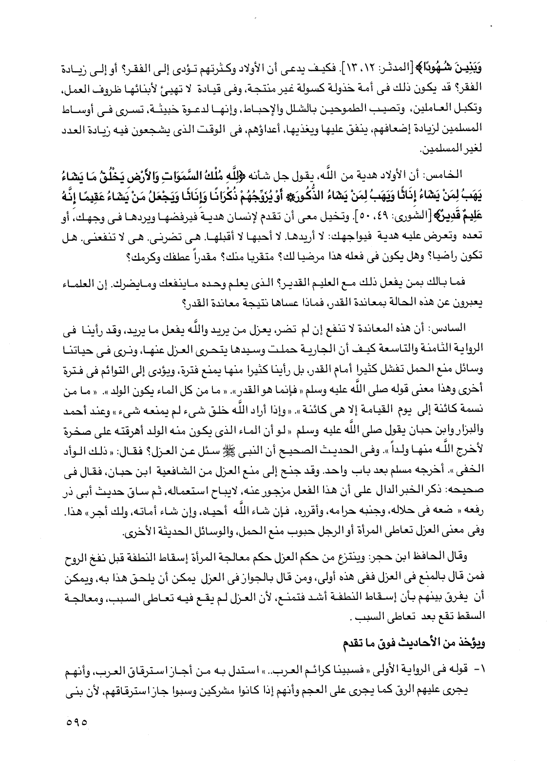 السادس: أن هذه المعاندة لا تنفع إن لم تضر، يعزل من يريد والله يفعل ما يريد، وقد رأينا في الرواية الثامنة والتاسعة كيف أن الجارية حملت وسيدها يتحرى العزل عنها، ونرى في حياتنا وسائل منع الحمل تفشل كثيراً أمام القدر، بل رأينا كثيراً منها يمنع فترة، ويؤدي إلى التوائم في فترة أخرى وهذا معنى قوله صلى الله عليه وسلم "فإنما هو القدر". "ما من كل الماء يكون الولد". "ما من نسمة كائنة إلى يوم القيامة إلا هي كائنة". "وإذا أراد الله خلق شيء لم يمنعه شيء" وعند أحمد والبزار وابن حبان يقول صلى الله عليه وسلم "لو أن الماء الذي يكون منه الولد أهرقته على صخرة لأخرج الله منها ولداً". وفي الحديث الصحيح أن النبي صلى الله عليه وسلم سئل عن العزل؟ فقال: "ذلك الوأد الخفي". أخرجه مسلم بعد باب واحد. وقد جنح إلى منع العزل من الشافعية ابن حبان، فقال في صحيحه: ذكر الخبر الدال على أن هذا الفعل مزجور عنه، لا يباح استعماله، ثم ساق حديث أبي ذر رفعه "ضعه في حلاله، وجنبه حرامه، وأقرره، فإن شاء الله أحياه، وإن شاء أماته، ولك أجر" هذا. وفي معنى العزل تعاطي المرأة أو الرجل حبوب منع الحمل، والوسائل الحديثة الأخرى.