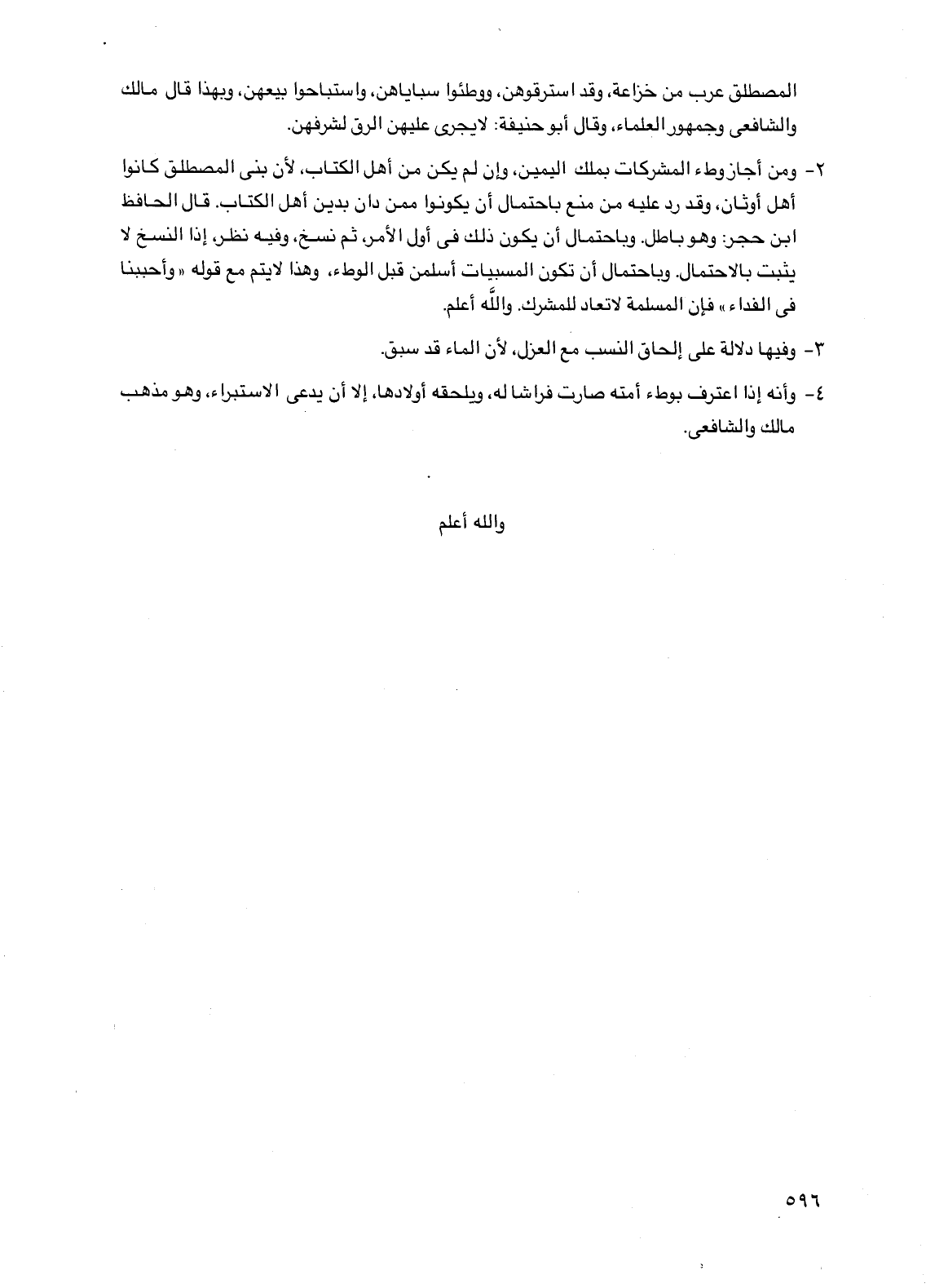 2 - ومن أجاز وطء المشركات بملك اليمين، وإن لم يكن من أهل الكتاب، لأن بني المصطلق كانوا أهل أوثان، وقد رد عليه من منع باحتمال أن يكونوا ممن دان بدين أهل الكتاب. قال الحافظ ابن حجر: وهو باطل. وباحتمال أن يكون ذلك في أول الأمر، ثم نسخ، وفيه نظر، إذا النسخ لا يثبت بالاحتمال. وباحتمال أن تكون المسبيات أسلمن قبل الوطء، وهذا لا يتم مع قوله "وأحببنا في الفداء" فإن المسلمة لا تعاد للمشرك. والله أعلم.