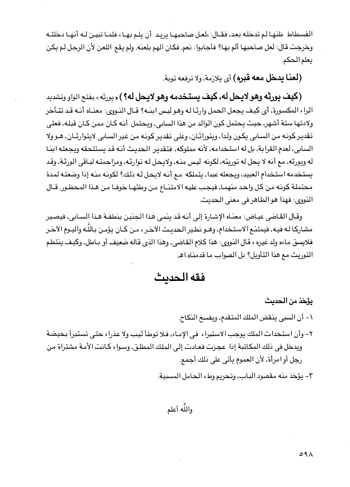 وقال القاضي عياض: معناه الإشارة إلى أنه قد ينمي هذا الجنين بنطفة هذا السابي، فيصير مشاركاً له فيه، فيمتنع الاستخدام، وهو نظير الحديث الآخر "من كان يؤمن بالله واليوم الآخر فلا يسق ماءه ولد غيره" قال النووي: هذا كلام القاضي، وهذا الذي قاله ضعيف أو باطل، وكيف ينتظم التوريث مع هذا التأويل؟ بل الصواب ما قدمناه. اهـ
