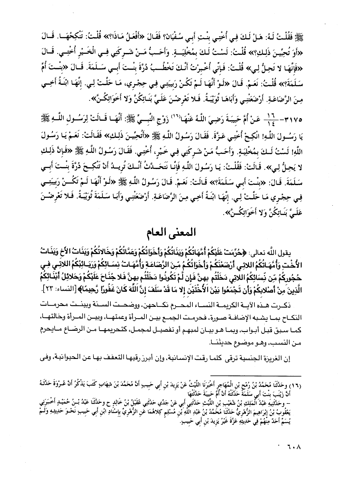 ذكرت هذه الآية الكريمة النساء المحرم نكاحهن، ووضحت السنة وبينت محرمات النكاح بما يشبه الإضافة صورة، فحرمت الجمع بين المرأة وعمتها، وبين المرأة وخالتها، كما سبق قبل أبواب، وبما هو بيان لمبهم أو تفصيل لمجمل، كتحريمها من الرضاع ما يحرم من النسب، وهو موضوع حديثنا.