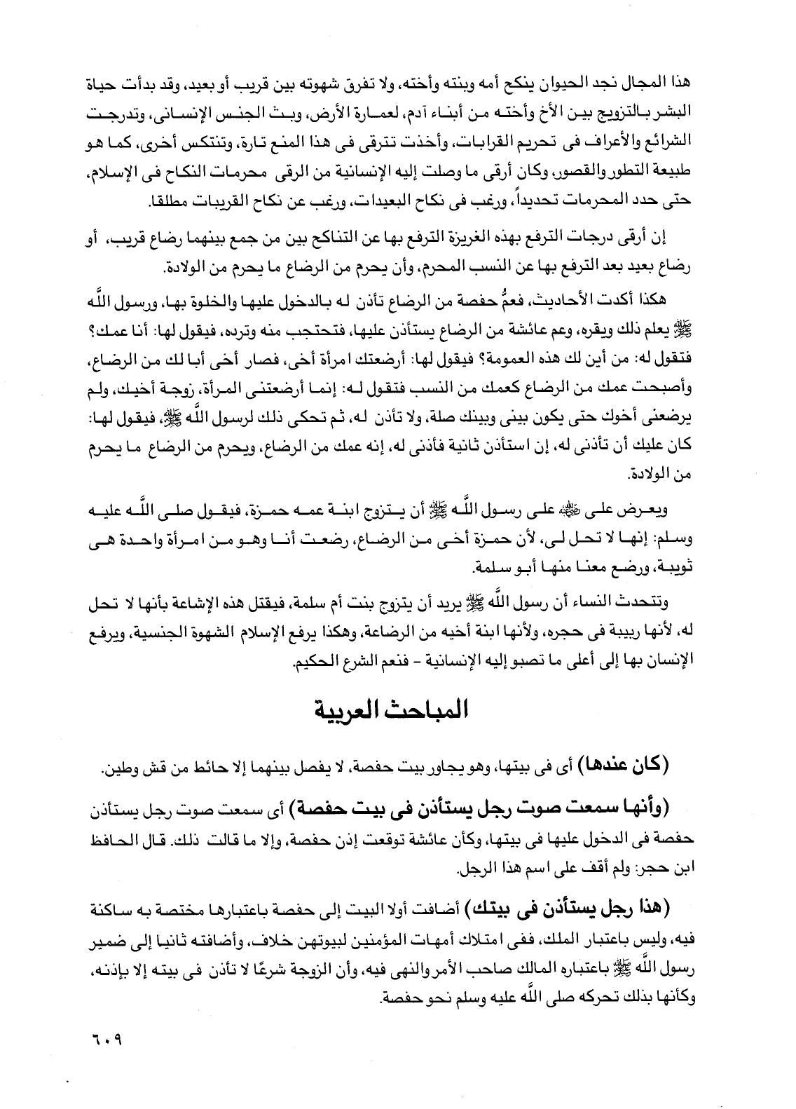 وتتحدث النساء أن رسول الله صلى الله عليه وسلم يريد أن يتزوج بنت أم سلمة، فيقتل هذه الإشاعة بأنها لا تحل له، لأنها ربيبة في حجره، ولأنها ابنة أخيه من الرضاعة، وهكذا يرفع الإسلام الشهوة الجنسية، ويرفع الإنسان بها إلى أعلى ما تصبو إليه الإنسانية -فنعم الشرع الحكيم.