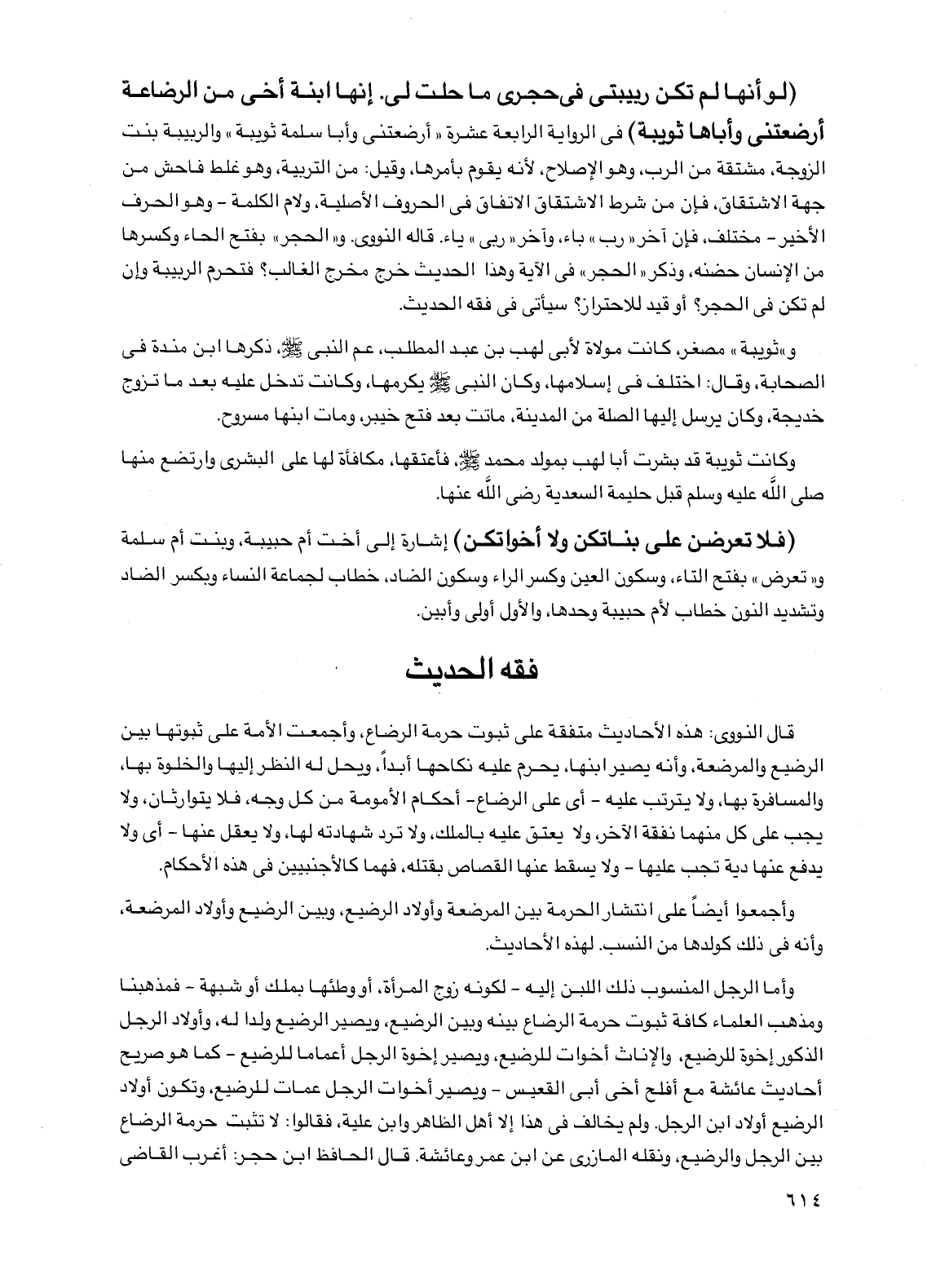 (لو أنها لم تكن ربيبتي في حجري ما حلت لي. إنها ابنة أخي من الرضاعة أرضعتني وأباها ثويبة) في الرواية الرابعة عشرة "أرضعتني وأبا سلمة ثويبة" والربيبة بنت الزوجة، مشتقة من الرب، وهو الإصلاح، لأنه يقوم بأمرها، وقيل: من التربية، وهو غلط فاحش من جهة الاشتقاق، فإن من شرط الاشتقاق الاتفاق في الحروف الأصلية، ولام الكلمة -وهو الحرف الأخير- مختلف، فإن آخر "رب" باء، وآخر "ربي" ياء. قاله النووي. و"الحجر" بفتح الحاء وكسرها من الإنسان حضنه، وذكر "الحجر" في الآية وهذا الحديث خرج مخرج الغالب؟ فتحرم الربيبة وإن لم تكن في الحجر؟ أو قيد للاحتراز؟ سيأتي في فقه الحديث.