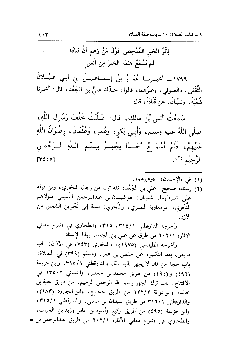 سَمِعْتُ أَنَسَ بْنَ مَالِكٍ قَالَ: صَلَّيْتُ خَلْفَ رَسُولِ اللَّهِ صَلَّى اللَّهُ عَلَيْهِ وَسَلَّمَ وَأَبِي بَكْرٍ وَعُمَرَ وَعُثْمَانَ رِضْوَانُ اللَّهِ عَلَيْهِمْ فَلَمْ أَسْمَعْ أَحَدًا يَجْهَرْ بِبِسْمِ اللَّهِ الرَّحْمَنِ الرحيم2. [5: 34]