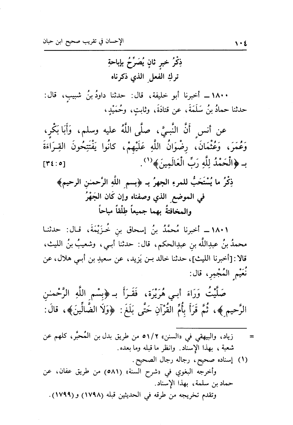 1800 - أَخْبَرَنَا أَبُو خَلِيفَةَ قَالَ: حَدَّثَنَا دَاوُدُ بْنُ شَبِيبٍ قَالَ: حَدَّثَنَا حَمَّادُ بْنُ سَلَمَةَ عَنْ قَتَادَةَ وَثَابِتٍ وَحُمَيْدٍ عَنْ أَنَسٍ أَنَّ النَّبِيَّ صَلَّى اللَّهُ عَلَيْهِ وَسَلَّمَ وَأَبَا بَكْرٍ وَعُمَرَ وَعُثْمَانَ رِضْوَانُ اللَّهِ عَلَيْهِمْ كَانُوا يَفْتَتِحُونَ الْقِرَاءَةَ بِـ {الْحَمْدُ لِلَّهِ رَبِّ الْعَالَمِينَ} 1. [5: 34]