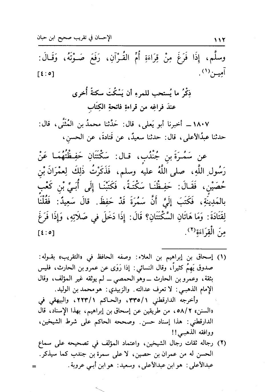 عَنْ سَمُرَةَ بْنِ جُنْدُبٍ قَالَ: سَكْتَتَانِ حَفِظْتُهُمَا عَنْ رَسُولِ اللَّهِ صَلَّى اللَّهُ عَلَيْهِ وَسَلَّمَ فَذَكَرْتُ ذَلِكَ لِعِمْرَانَ بْنِ حُصَيْنٍ فَقَالَ: حَفِظْنَا سَكْتَةً فَكَتَبْنَا إِلَى أُبَيِّ بْنِ كَعْبٍ بِالْمَدِينَةِ فَكَتَبَ إِلَيَّ أَنَّ سَمُرَةَ قَدْ حَفِظَ. قَالَ سَعِيدٌ: فَقُلْنَا لِقَتَادَةَ وَمَا هَاتَانِ السَّكْتَتَانِ؟ قَالَ: إِذَا دَخَلَ في صلاته وإذا فرغ من القراءة2. [5: 4]