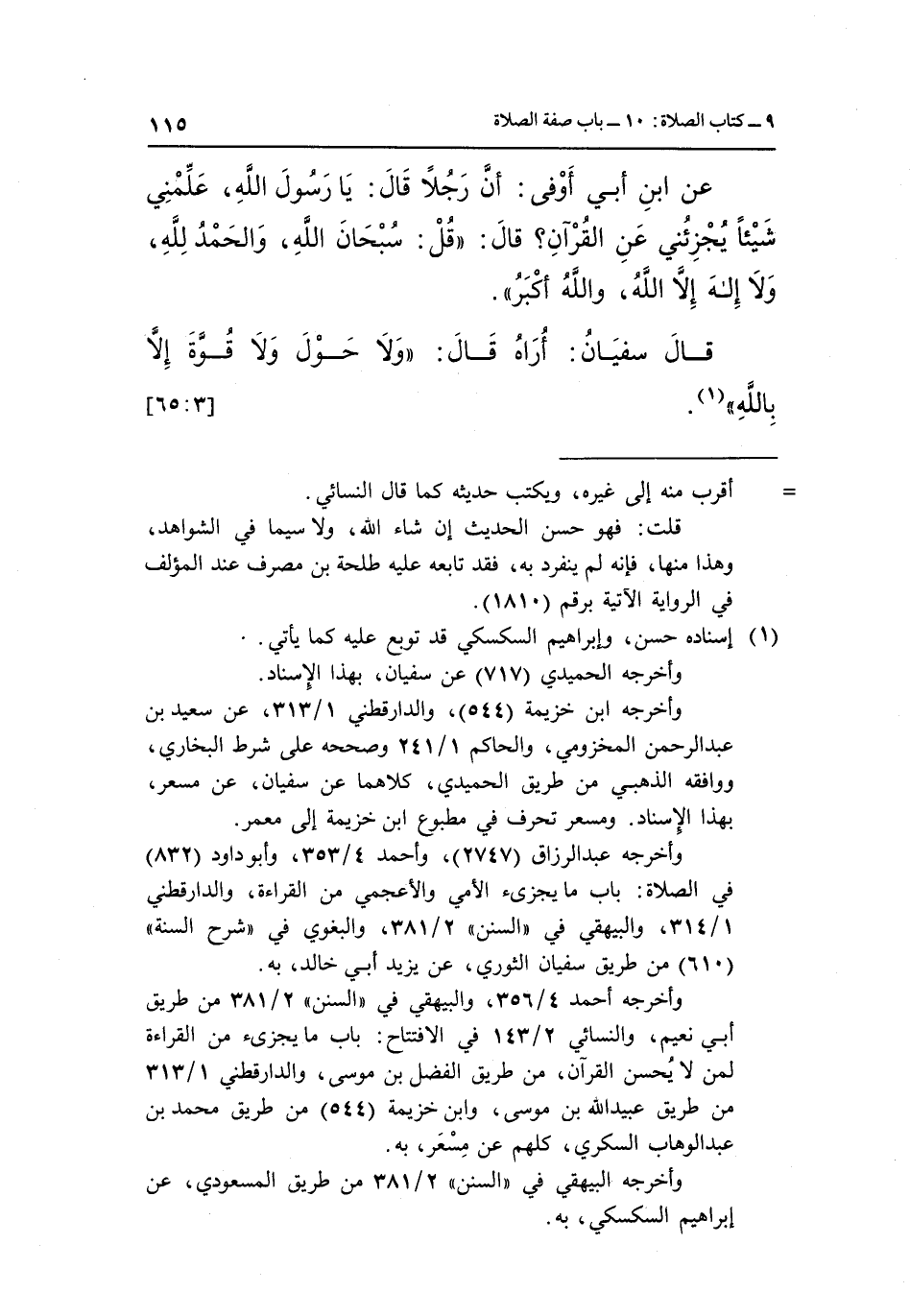 عن بن أَبِي أَوْفَى: أَنَّ رَجُلًا قَالَ: يَا رَسُولَ اللَّهِ عَلِّمْنِي شَيْئًا يُجْزِئُنِي عَنِ الْقُرْآنِ؟ قَالَ: "قل سُبْحَانَ اللَّهِ وَالْحَمْدُ لِلَّهِ وَلَا إِلَهَ إِلَّا اللَّهُ وَاللَّهُ أَكْبَرُ".