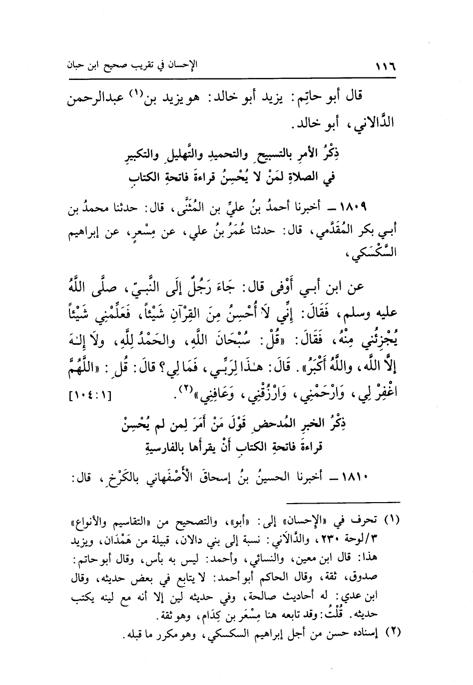 1 تحرف في "الإحسان" إلى: "أبو"، والصحيح من "التقاسيم والأنواع" 3/لوحة 230، والدالاني: نسبة إلى بني دالان، قبيلة من همدان، ويزيد هذ1: قال ابن معين، والنسائي وأحمد: ليس به بأنس، وقال أبو حاتم: صدوق، ثقة، وقال الحاكم أبو أحمد: لا يتابع في بعض أحاديثه، وقال ابن عدي: له أحاديث صالحة، وفي حديث لين إلا أنه مع لينه يكتب حديثه. قلت: وقد تابعه هنا مسعر بن كدام، وهو ثقة.