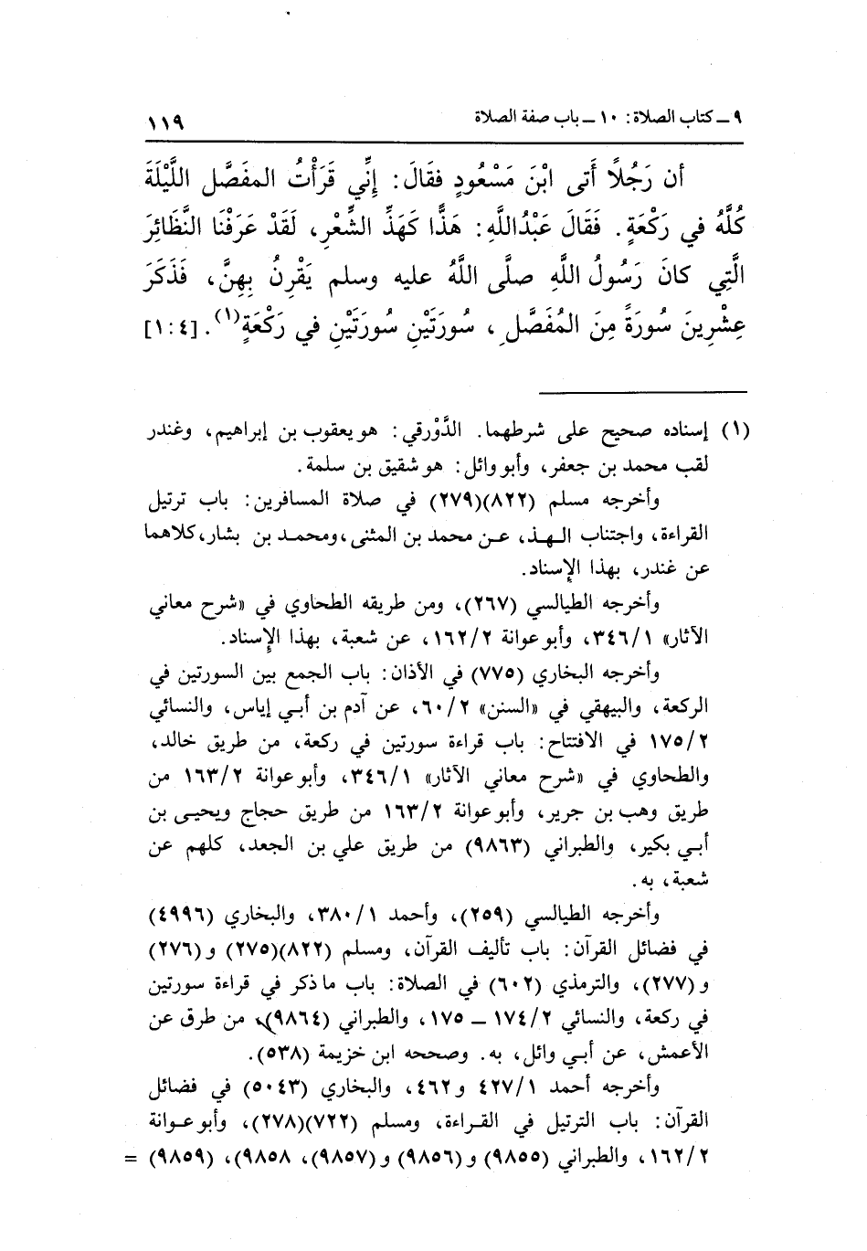 أن رجلا أتى بن مَسْعُودٍ فَقَالَ: إِنِّي قَرَأْتُ الْمُفَصَّلَ اللَّيْلَةَ كُلَّهُ فِي رَكْعَةٍ. فَقَالَ عَبْدُ اللَّهِ: هَذَا كَهَذِّ الشِّعْرِ لَقَدْ عَرَفْنَا النَّظَائِرَ الَّتِي كَانَ رَسُولُ اللَّهِ صَلَّى اللَّهُ عَلَيْهِ وَسَلَّمَ يَقْرِنُ بِهِنَّ فَذَكَرَ عِشْرِينَ سُورَةً مِنَ الْمُفَصَّلِ سُورَتَيْنِ سُورَتَيْنِ في ركعة1. [4: 1]