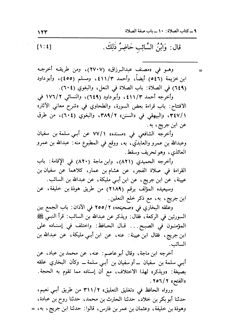 وعلقه البخاري في "صحيحه" 2/255 في الأذان: باب الجمع بين السورتين في الركعة، فقال: ويذكر عبد الله بن السائب: قرأ النبي صلى الله عليه وسلم المؤمنون في الصبح ... قال الحافظ: واختلف في إسناده على ابن جريج، فقال ابن عيينة: عنه، عن ابن أبي مليكة، عن عبد الله بن السائب.