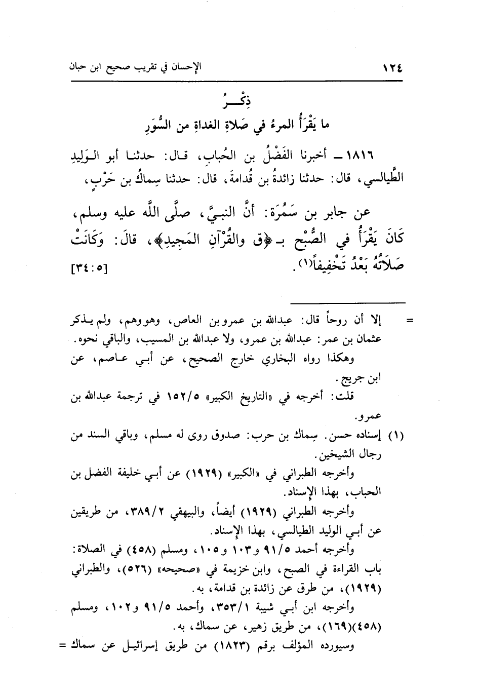 1816 - أَخْبَرَنَا الْفَضْلُ بْنُ الْحُبَابِ قَالَ: حَدَّثَنَا أَبُو الْوَلِيدِ الطَّيَالِسِيُّ قَالَ: حَدَّثَنَا زَائِدَةُ بْنُ قُدَامَةَ قَالَ: حَدَّثَنَا سِمَاكُ بْنُ حَرْبٍ عَنْ جَابِرِ بْنِ سَمُرَةَ: أَنَّ النَّبِيَّ صَلَّى اللَّهُ عَلَيْهِ وَسَلَّمَ كَانَ يَقْرَأُ فِي الصُّبْحِ بـ {ق وَالْقُرْآنِ الْمَجِيدِ} ، قال: وكانت صلاته بعد تخفيفا1. [5: 34]