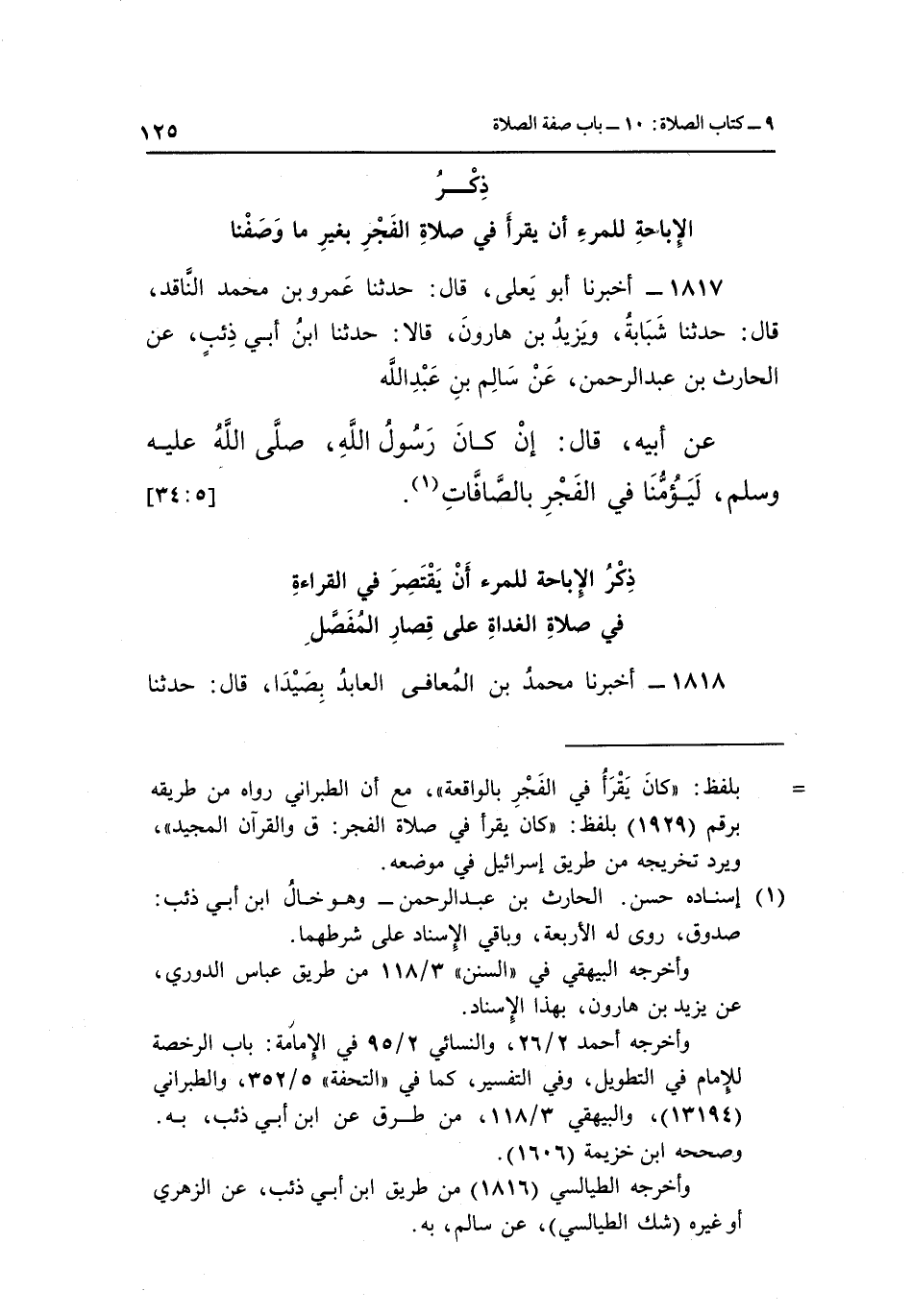 1817 - أَخْبَرَنَا أَبُو يَعْلَى قَالَ: حَدَّثَنَا عَمْرُو بْنُ مُحَمَّدٍ النَّاقِدُ قَالَ: حَدَّثَنَا شَبَابَةُ وَيَزِيدُ بْنُ هَارُونَ قَالَا: حَدَّثَنَا ابْنُ أَبِي ذِئْبٍ عَنِ الْحَارِثِ بْنِ عَبْدِ الرَّحْمَنِ عَنْ سَالِمُ بْنُ عَبْدِ اللَّهِ