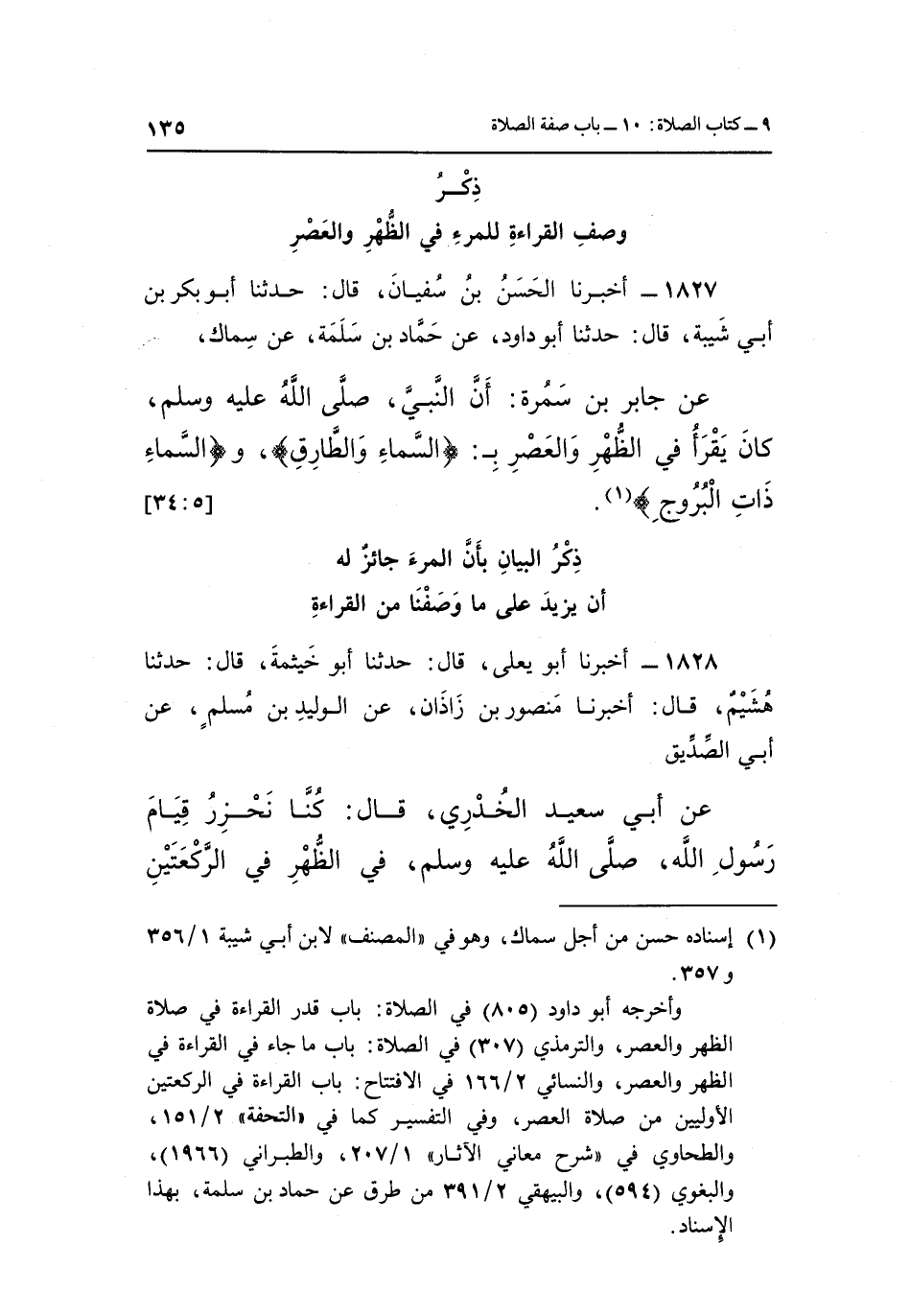 1827 - أَخْبَرَنَا الْحَسَنُ بْنُ سُفْيَانَ قَالَ: حَدَّثَنَا أَبُو بَكْرِ بْنُ أَبِي شَيْبَةَ قَالَ: حَدَّثَنَا أَبُو دَاوُدَ عَنْ حَمَّادِ بْنِ سَلَمَةَ عَنْ سِمَاكٍ