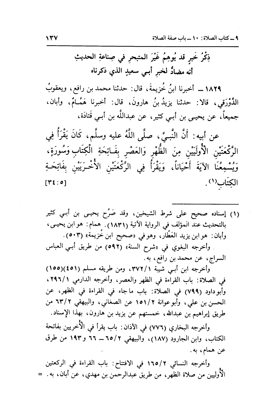 1829 - أَخْبَرَنَا ابْنُ خُزَيْمَةَ قَالَ: حَدَّثَنَا مُحَمَّدُ بْنُ رَافِعٍ وَيَعْقُوبُ الدَّوْرَقِيُّ قَالَا: حَدَّثَنَا يَزِيدُ بْنُ هَارُونَ قَالَ: أَخْبَرَنَا هَمَّامٌ وَأَبَانُ جَمِيعًا عَنْ يَحْيَى بْنِ أَبِي كَثِيرٍ عَنْ عَبْدِ اللَّهِ بْنِ أَبِي قَتَادَةَ،