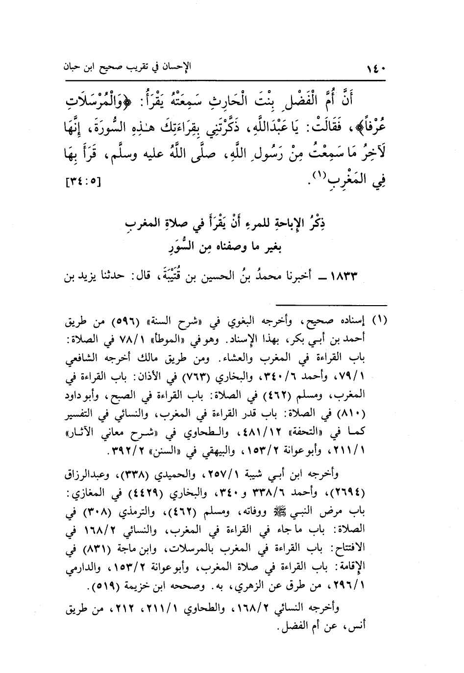 أَنَّ أُمَّ الْفَضْلِ بِنْتَ الْحَارِثِ سَمِعَتْهُ يَقْرَأُ: {وَالْمُرْسَلاتِ عُرْفاً} فَقَالَتْ يَا عَبْدَ اللَّهِ ذَكَّرْتَنِي بِقِرَاءَتِكَ هَذِهِ السُّورَةَ إِنَّهَا لَآخِرُ مَا سَمِعْتُ مِنْ رَسُولِ اللَّهِ صَلَّى اللَّهُ عَلَيْهِ وَسَلَّمَ قرأ بها في المغرب1. [5: 34]