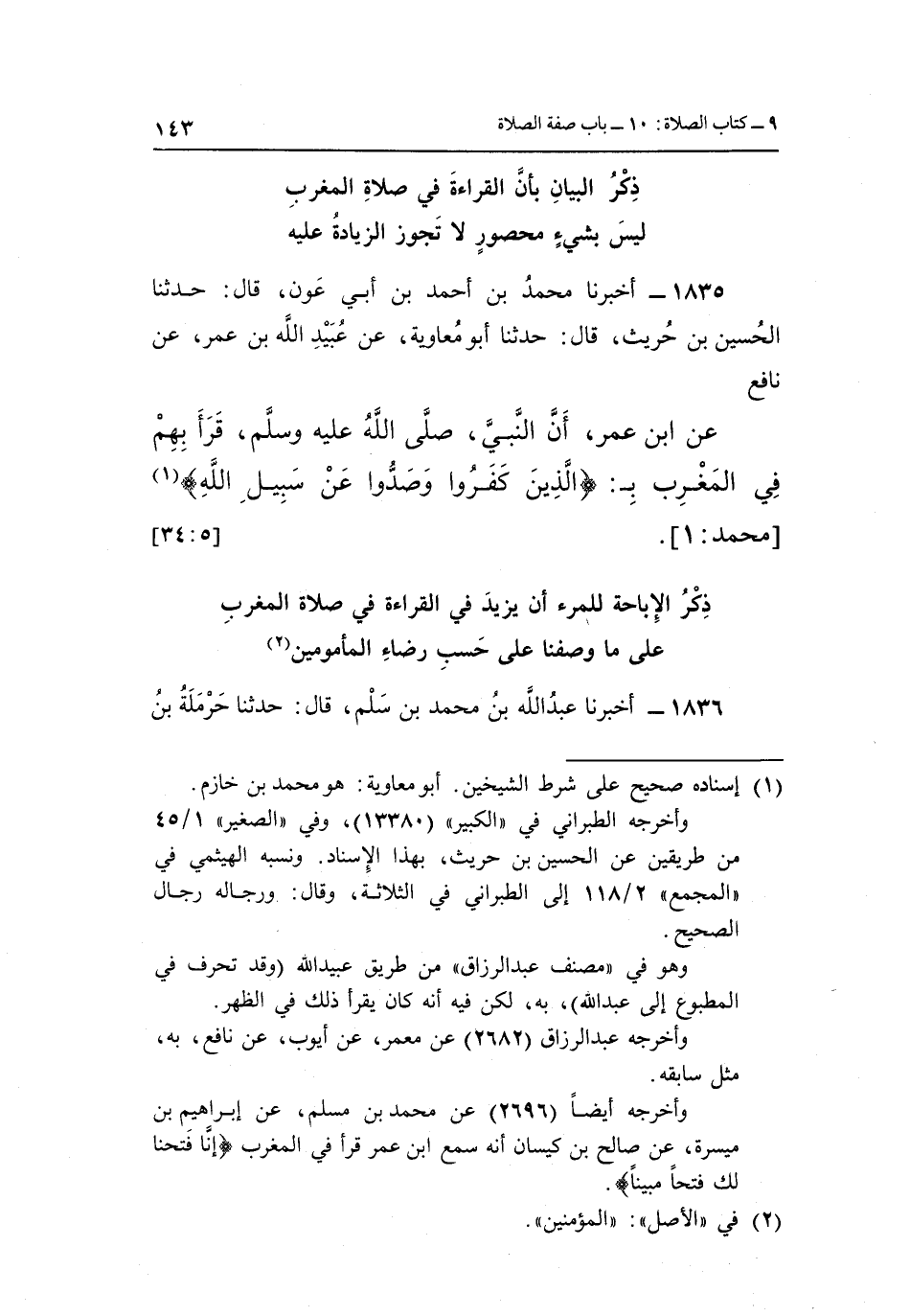 ذِكْرُ الْإِبَاحَةِ لِلْمَرْءِ أَنْ يَزِيدَ فِي الْقِرَاءَةِ فِي صَلَاةِ الْمَغْرِبِ عَلَى مَا وَصَفْنَا عَلَى حَسْبِ رِضَاءِ الْمَأْمُومِينَ2