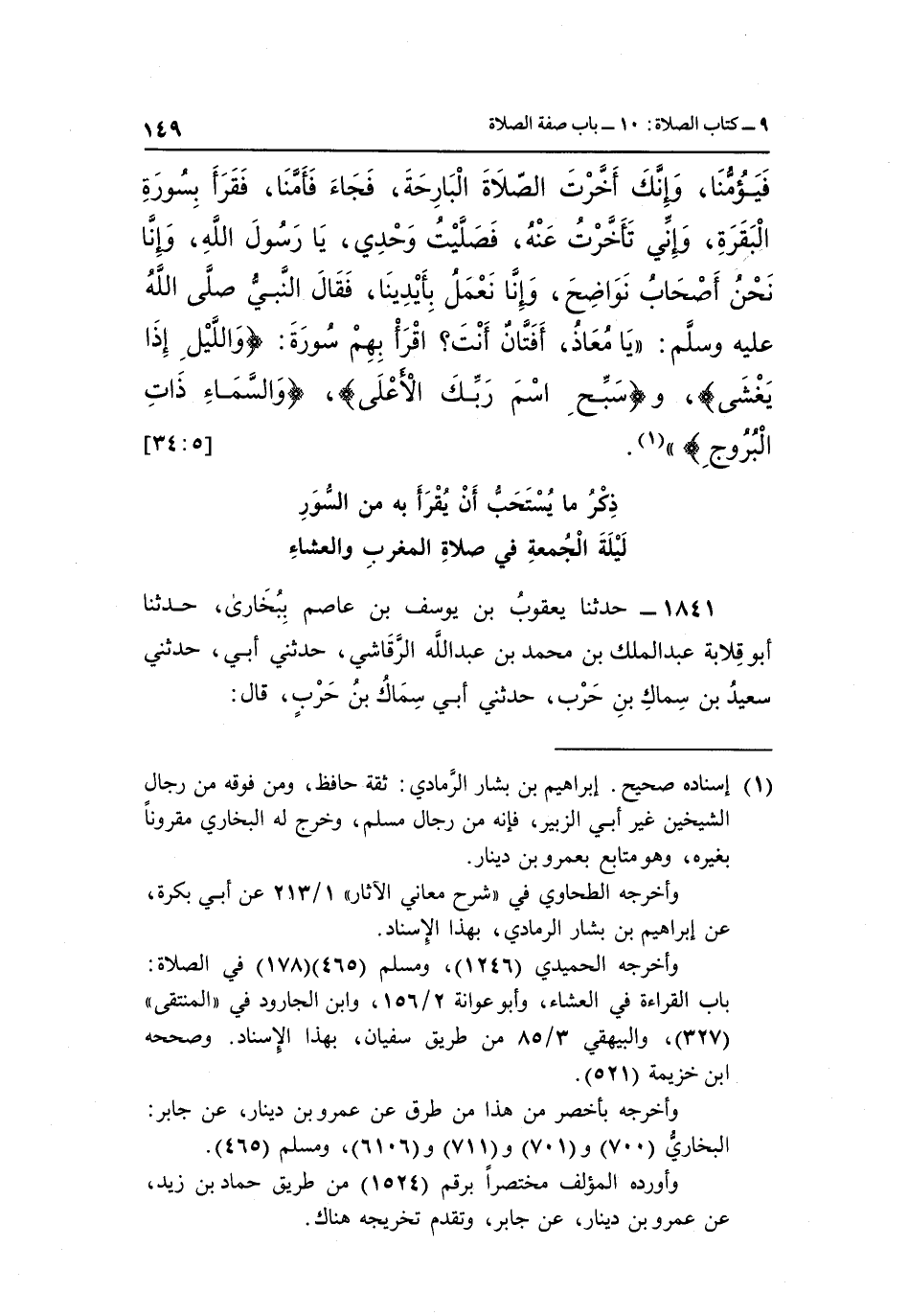 فَيَؤُمُّنَا، وَإِنَّكَ أَخَّرْتَ الصَّلَاةَ الْبَارِحَةَ، فَجَاءَ فَأَمَّنَا، فَقَرَأَ بِسُورَةِ الْبَقَرَةِ، وَإِنِّي تَأَخَّرْتُ عَنْهُ، فَصَلَّيْتُ وَحْدِي، يَا رَسُولَ اللَّهِ، وَإِنَّا نَحْنُ أَصْحَابُ نَوَاضِحَ، وَإِنَّا نَعْمَلُ بِأَيْدِينَا، فَقَالَ النَّبِيُّ صَلَّى اللَّهُ عَلَيْهِ وَسَلَّمَ: "يَا مُعَاذُ أَفَتَّانٌ أَنْتَ؟ اقرأ بهم سورة: {وَاللَّيْلِ إِذَا يَغْشَى} ، و {سَبِّحِ اسْمَ رَبِّكَ الْأَعْلَى} ، {وَالسَّمَاءِ ذَاتِ الْبُرُوجِ} " 1. [5: 34]