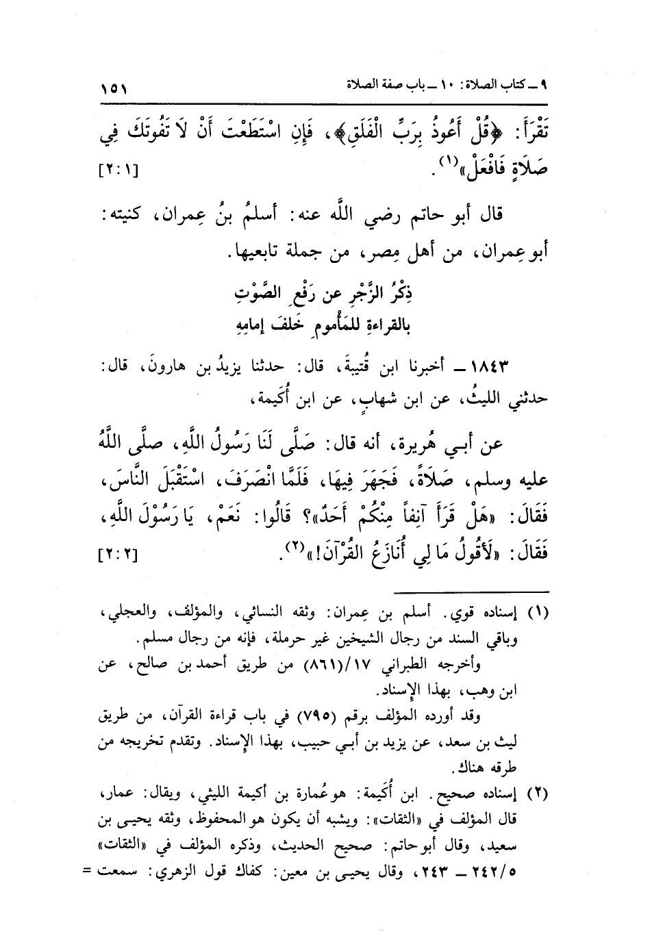 تَقْرَأَ: {قُلْ أَعُوذُ بِرَبِّ الْفَلَقِ} ، فَإِنِ اسْتَطَعْتَ أَنْ لَا تَفُوتَكَ فِي صَلَاةٍ فَافْعَلْ" 1. [1: 2]