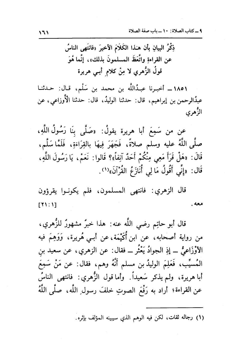 قال أبو حاتم رضي الله تعالى عَنْهُ: هَذَا خَبَرٌ مَشْهُورٌ لِلزُّهْرِيِّ، مِنْ رِوَايَةِ أَصْحَابِهِ، عَنِ ابْنِ أُكَيْمَةَ، عَنْ أَبِي هُرَيْرَةَ، وَوَهِمَ فِيهِ الْأَوْزَاعِيُّ -إِذِ الْجَوَادُ يَعْثُرُ- فَقَالَ: عَنِ الزُّهْرِيِّ، عَنْ سَعِيدِ بْنِ الْمُسَيِّبِ، فَعَلِمَ الْوَلِيدُ بْنُ مُسْلِمٍ أَنَّهُ وَهِمَ، فَقَالَ: عَنْ مَنْ سَمِعَ أَبَا هُرَيْرَةَ، وَلَمْ يَذْكُرْ سَعِيدًا. وَأَمَّا قَوْلُ الزُّهْرِيِّ: فَانْتَهَى النَّاسُ عَنِ الْقِرَاءَةِ؛ أَرَادَ بِهِ رَفْعَ الصَّوْتِ خَلْفَ رَسُولِ اللَّهِ